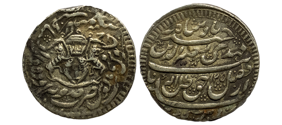 PS, Awadh, Nasir ud-din Haidar (AH 1243-1253 / 1827-1837 AD), Suba Awadh Dar-us-Sultanat Lakhnau Mint, Silver Rupee, 1250/7 RY, "Fazle Haq zille Elah" couplet, Obv: Persian legend "sikka zad bar seem wa zar az fazle haque zille elah, nayeb-e-mehdi Naseer-ud-din Haidar Badshah" with Hijri year, Rev: crown flanked by rampant lions holding a flag, two upright fish below, Persian legend "zarb Suba Awadh sanah julus, manus maimanat dar-us-sultana",(KM # 205.3,/ MK# 8.39), Very Fine+, Very Rare, Nazrana Flan with borders on both sides, struck with ¼ rupee die.
