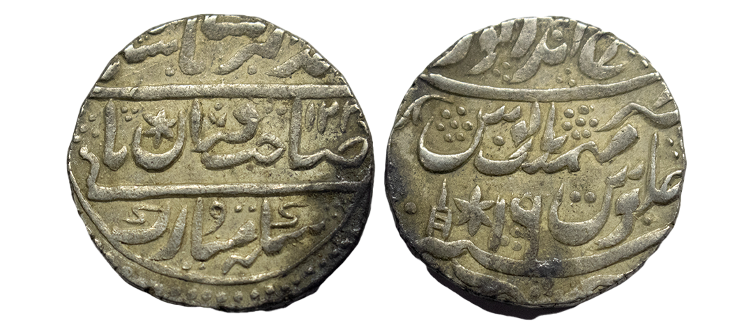 Bharatpur, Randhir Singh (AH 1220-1239; 1805-1823AD), Silver Rupee, 11.16Grms, Brajinderpur Mint, in the name of Muhammad Akbar II, RY16, Star and dagger symbol on rev as a mint mark. (KM # 106a). Very Fine.