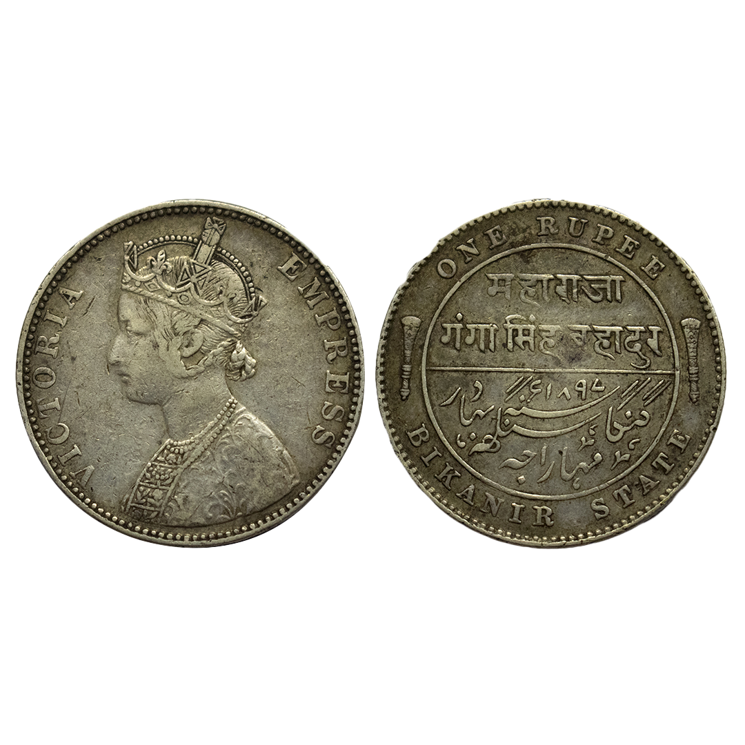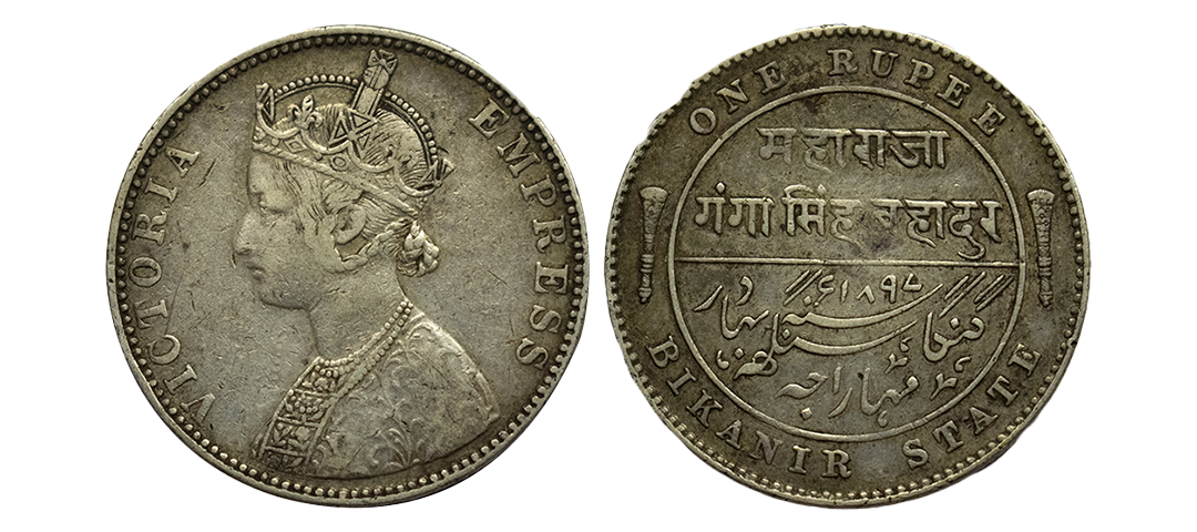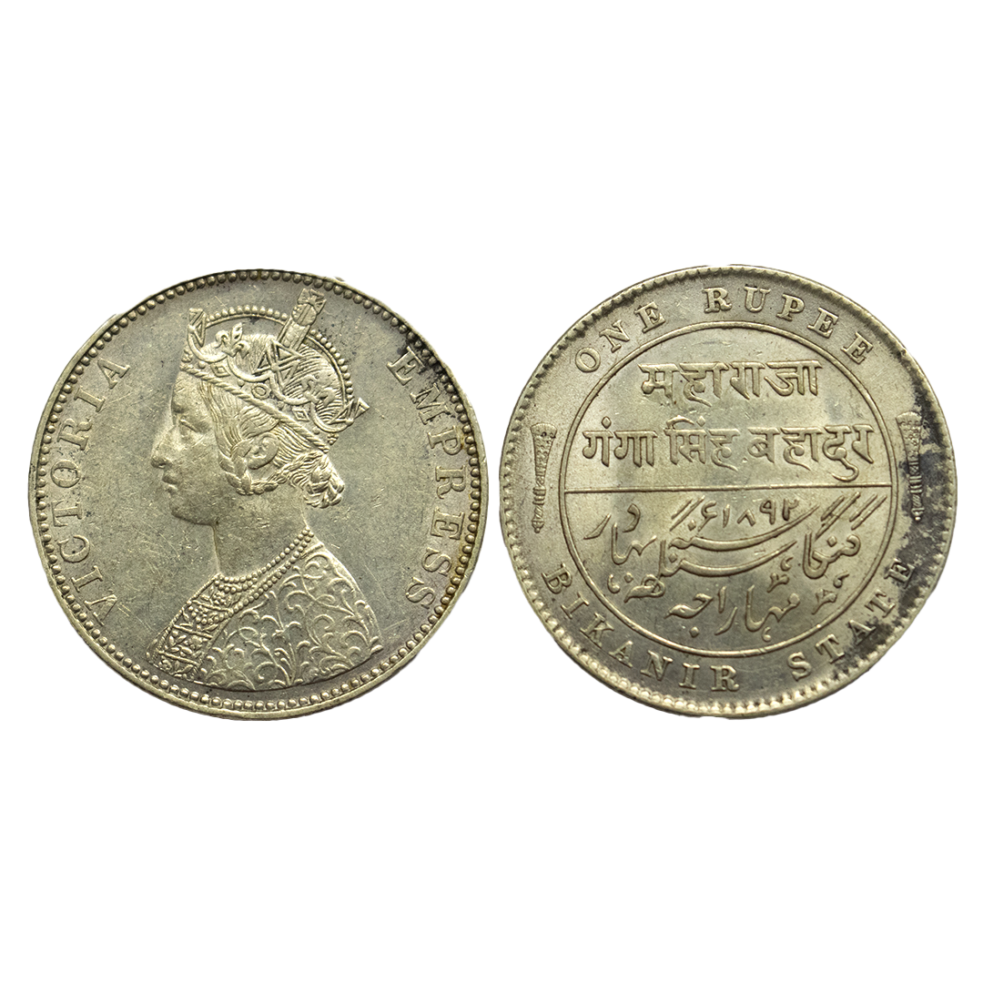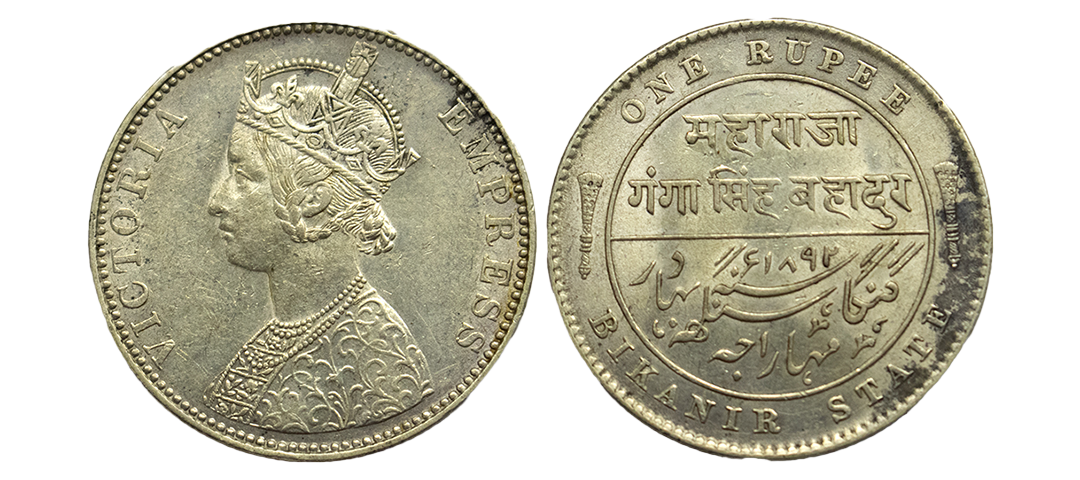Indian Princely States, Bharatpur State, Jaswant Singh (AH 1269-1311, 1853-1893 AD), Silver Nazrana Rupee, 11.05 gms, 21.72 mm, Braj Indrapur Mint, VS 1914, AD 1858, Obv: potrait in the middle and legend malika muazzama firman rawai inglistan around, AD date 1858 below, Rev: legend zul iqtidar angrez sarkar zarb braja indrapur 1914 and katar and star symbols KM # 166.2, very fine+, extremely rare.