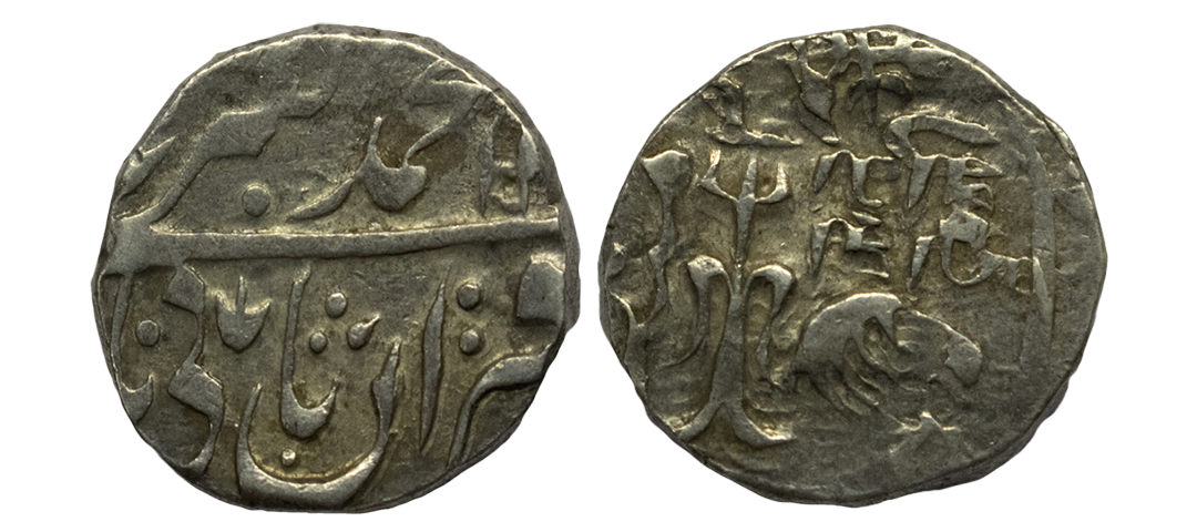 Indian Princely States, Gwalior State, Baija Bai (AH 1243-1249, 1827-1833 AD), INO Muhammad Akbar II (AH 1221-1253, 1806-1837 AD), Silver Rupee, 10.95 gms, Lashkar Mint, Frozen RY 23, “Shri” in Nagari & five flowered symbol, KM # 65, very fine+, very scarce.