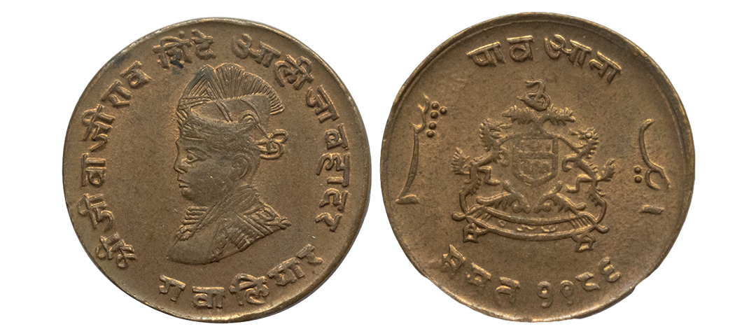Indian Princely States, Gwalior State, Baija Bai (AH 1243-1249, 1827-1833 AD), INO Muhammad Akbar II (AH 1221-1253, 1806-1837 AD), Silver Rupee, 10.95 gms, Lashkar Mint, Frozen RY 23, “Shri” in Nagari & five flowered symbol, KM # 65, very fine+, very scarce.