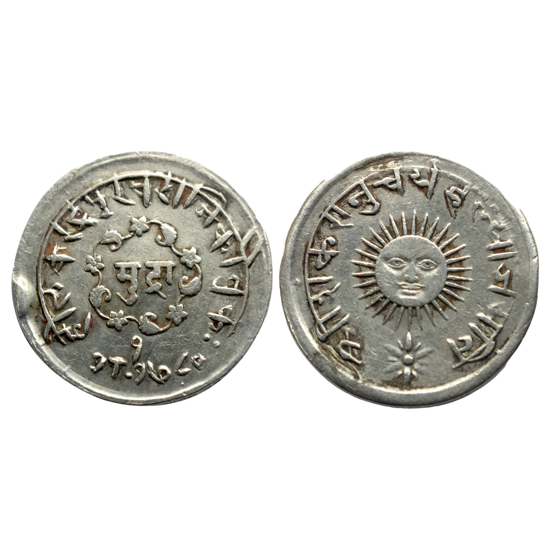 Indore, Tukoji Rao II (1844-1886 AD), Silver Presentation Mudra, 11.15g, Indore Mint, Saka 1780 (AD 1858). Obv: Nagari legend Shri Shankaranucharya Ahlya Jayati around sun face. Rev: Word Mudra in circle around Nagari legend Holakarendra Puravaraji Kautukah below Saka 1780, KM 15.Extremely Fine, Very Rare. No Exmount in the coin only a small counter mark on the edge, no sign of any mouting seen.