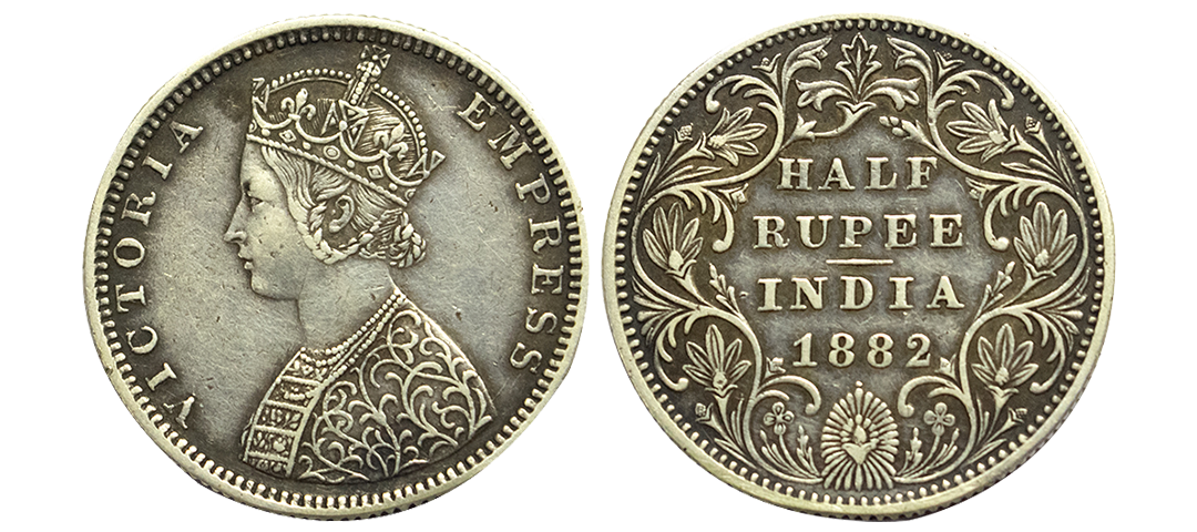 British India, Victoria Empress (1862-1901 AD), Silver 1/2 Rupee, 5.76 gms, 1880 AD, Calcutta Mint, Prid # 264, very fine+, extremely rare.