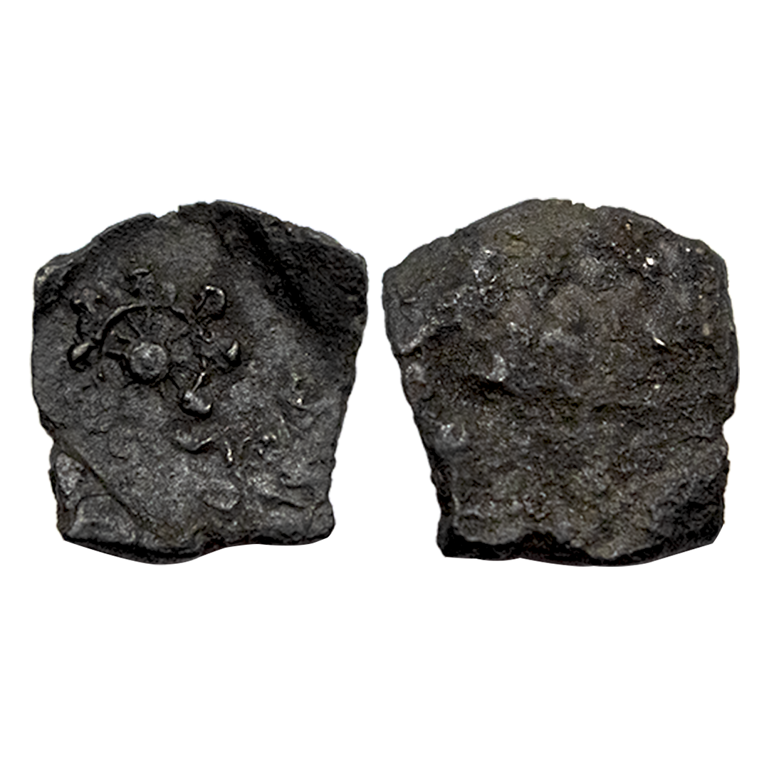 Punch-Marked, Mauryan Period, Ujjaini Region, Silver Karshapana, 3.38Grms, G/H Series VI, OBV: Sun, six armed, geometric symbol, three arched hill with crescent and figure of Mahakal holding stick and water pot, REV: Banker mark. (Gupta & Hardaker # 566). Fine+.