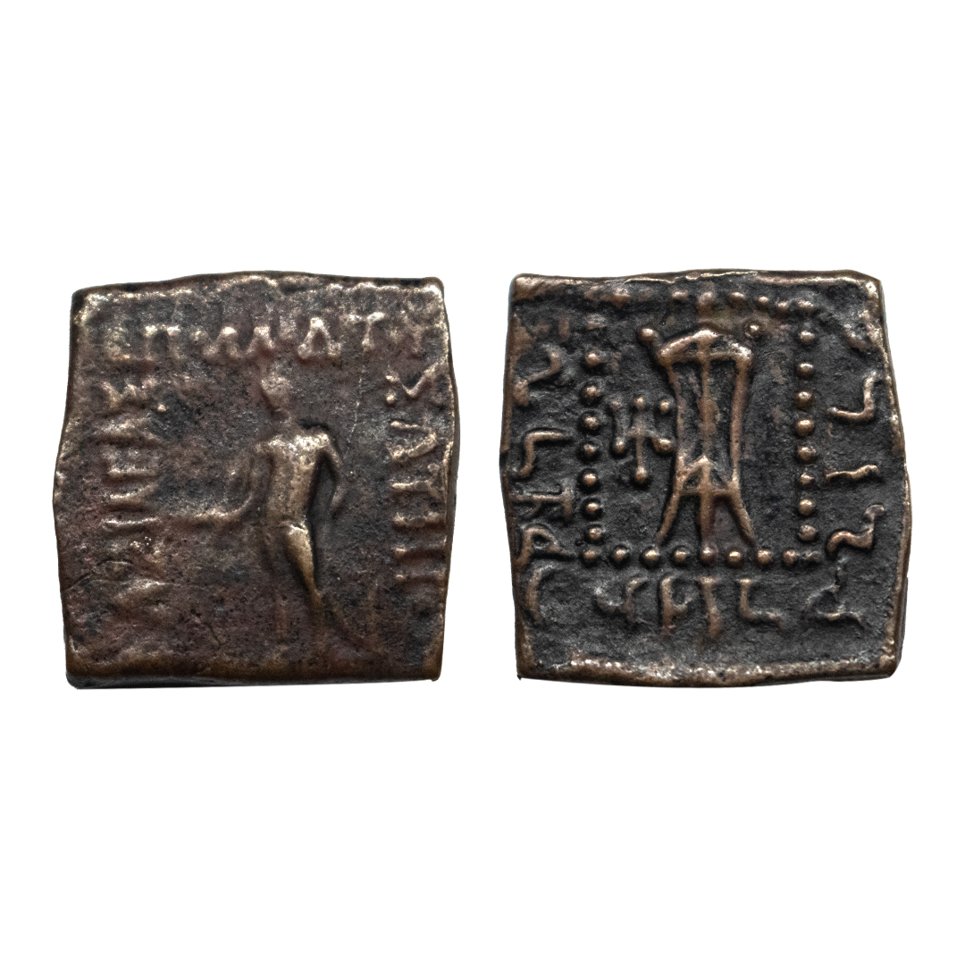 Paratarajas, Koziya (BC 270-230), Copper Drachma, 2.28Grms, OBV: Bust of king with wearing crown facing to left side, REV: Swastika in center around traces of Kharoshti legend ( P. Tandon # JONS 204). Fine.
