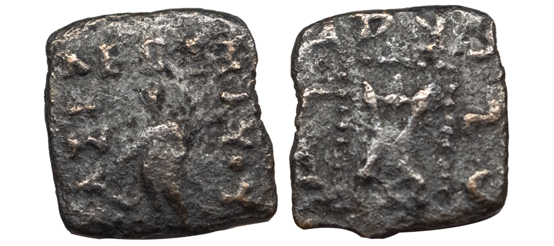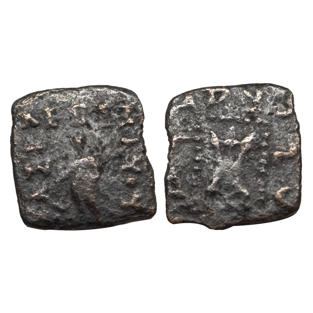 Indo-Greeks, Hippostratos (c. 80-60 BC), Square Copper, 1.54g, OBV: Apollo with quiver on back, standing left, holding arrow with Greek legend, Rev: Tripod with tamgha on right and Kharoshthi legend. Fine.