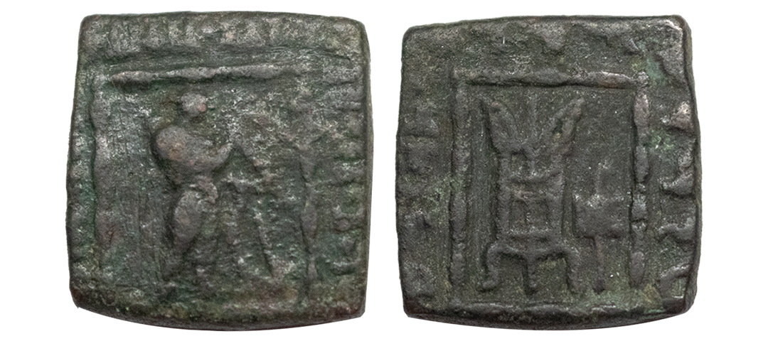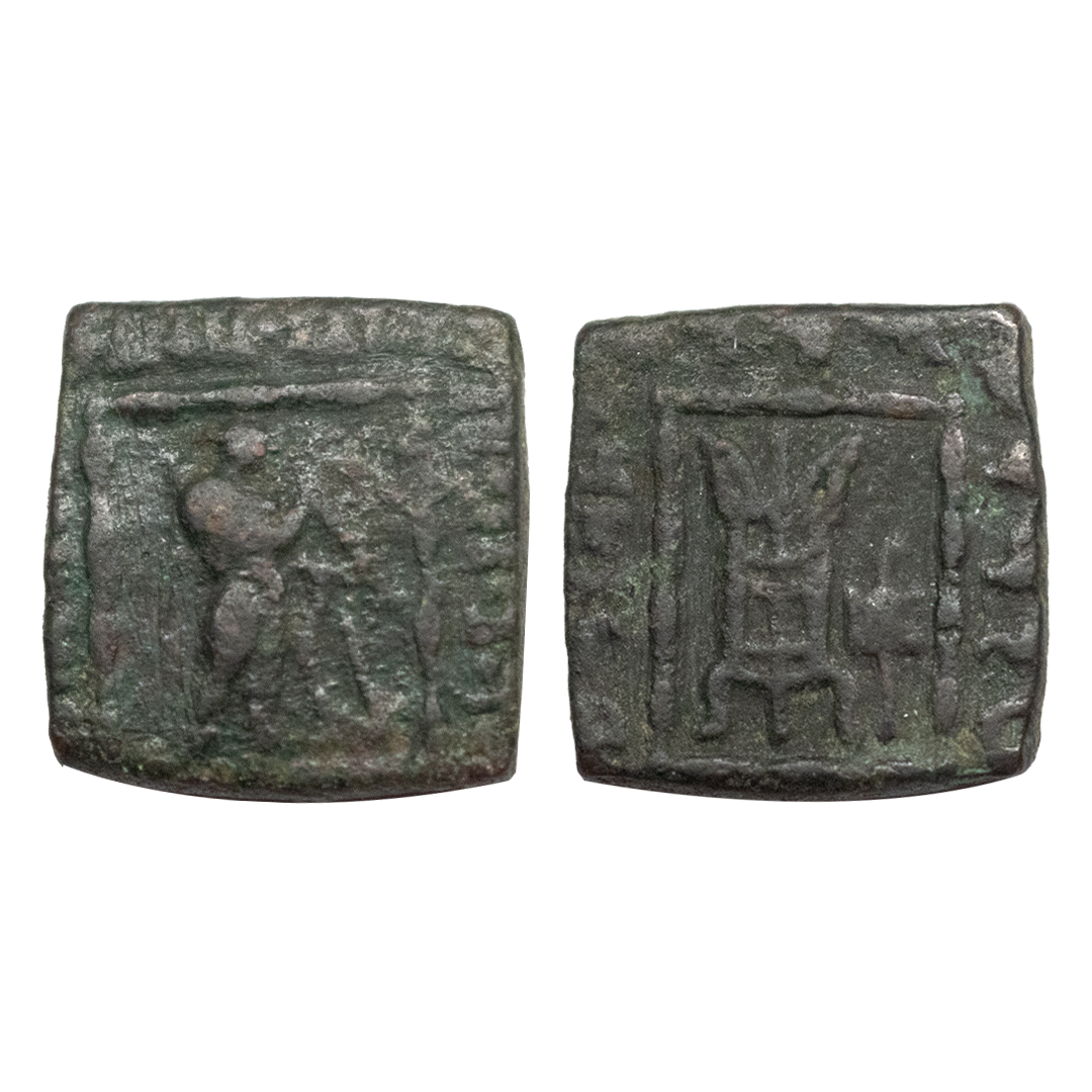 Indo-Greeks, Hippostratos (c. 80-60 BC), Square Copper, 9.54Grms, OBV: Apollo with quiver on back, standing right, holding arrow with Greek legend, REV: Tripod with tamgha on right and Kharoshthi legend. ( Bopearachchi # 9A). Fine.