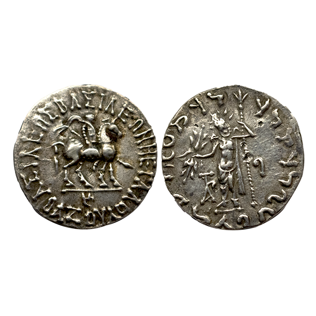 Indo-Scythians, Azes I, Silver Tetradrachm, 9.15Grms, OBV: King holding spear, mounted on horse waking to right, around Greek legend ‘BASILEOS BASILEON MEGALOY AZOY’, REV: Zeus standing facing to left, holding long sceptre in left hand and thunderbolt in right hand with Kharoshthi legend ‘Maharajasa rajarajasa Mahatasa Ayasa’. (Bopearachchi & Rahman # 718). Very Fine.
