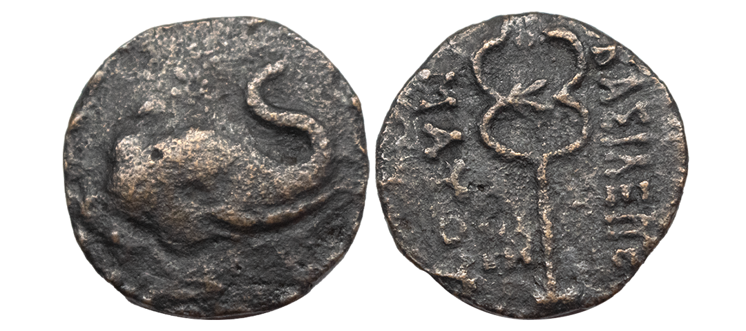INDO-SCYTHIAN, Vonones with Spalahores Silver tetradrachm, 9.50Grms, Obverse King mounted on horse right, holding spear, Greek legend around: BAΣIΛEωΣ BAΣIΛEΩN MEΓAΛOY / ONΩNOY, Reverse: Zeus standing facing, holding sceptre and thunderbolt, monogram at right, Kharoshthi legend around: maharajabhrata dhramikasa / spalahorasa, Extremely Rare.