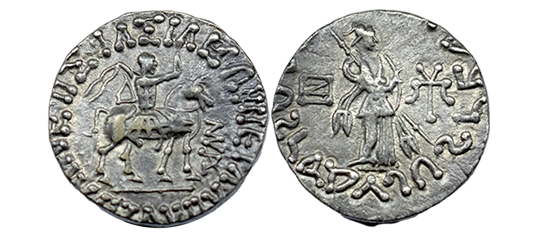 INDO-SCYTHIAN, Vonones with Spalahores Silver tetradrachm, 9.50Grms, Obverse King mounted on horse right, holding spear, Greek legend around: BAΣIΛEωΣ BAΣIΛEΩN MEΓAΛOY / ONΩNOY, Reverse: Zeus standing facing, holding sceptre and thunderbolt, monogram at right, Kharoshthi legend around: maharajabhrata dhramikasa / spalahorasa, Extremely Rare.