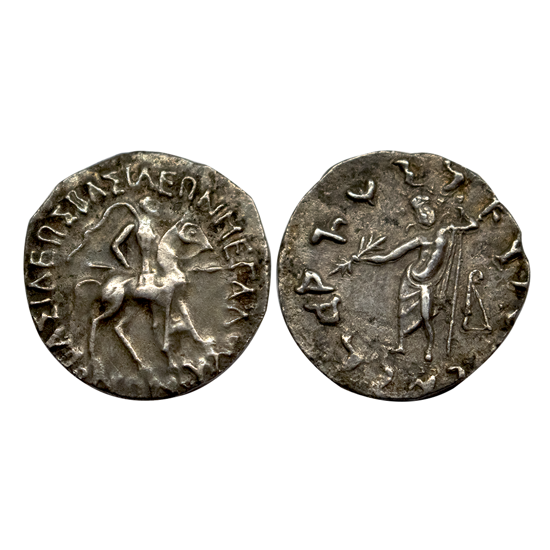 INDO-SCYTHIAN, Vonones with Spalahores Silver tetradrachm, 9.50Grms, Obverse King mounted on horse right, holding spear, Greek legend around: BAΣIΛEωΣ BAΣIΛEΩN MEΓAΛOY / ONΩNOY, Reverse: Zeus standing facing, holding sceptre and thunderbolt, monogram at right, Kharoshthi legend around: maharajabhrata dhramikasa / spalahorasa, Extremely Rare.