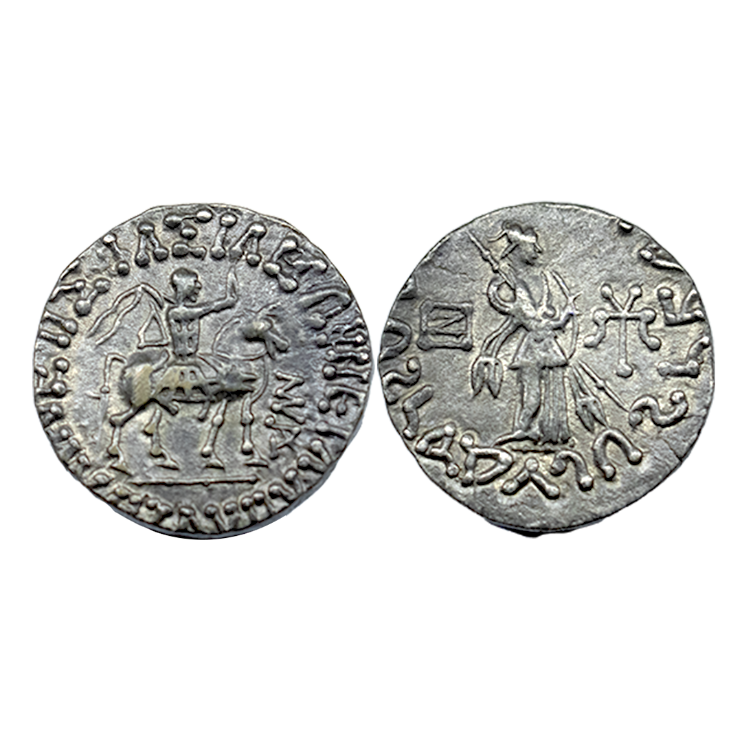 INDO-SCYTHIAN, Vonones with Spalahores Silver tetradrachm, 9.50Grms, Obverse King mounted on horse right, holding spear, Greek legend around: BAΣIΛEωΣ BAΣIΛEΩN MEΓAΛOY / ONΩNOY, Reverse: Zeus standing facing, holding sceptre and thunderbolt, monogram at right, Kharoshthi legend around: maharajabhrata dhramikasa / spalahorasa, Extremely Rare.