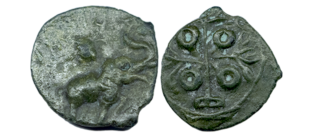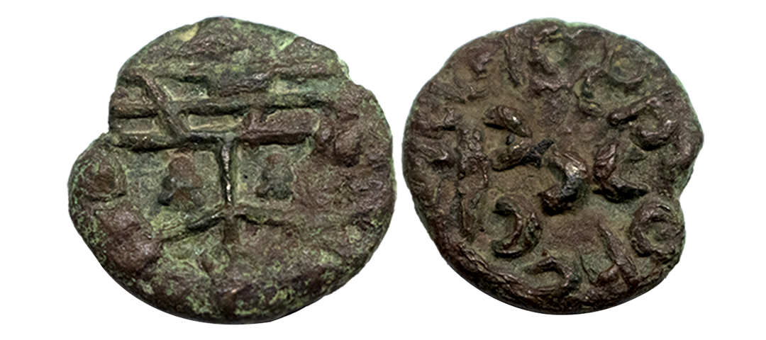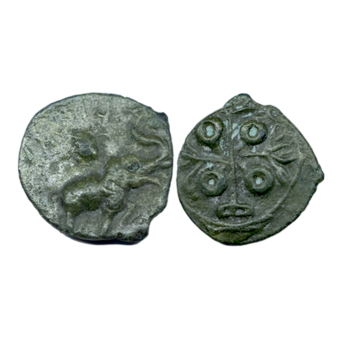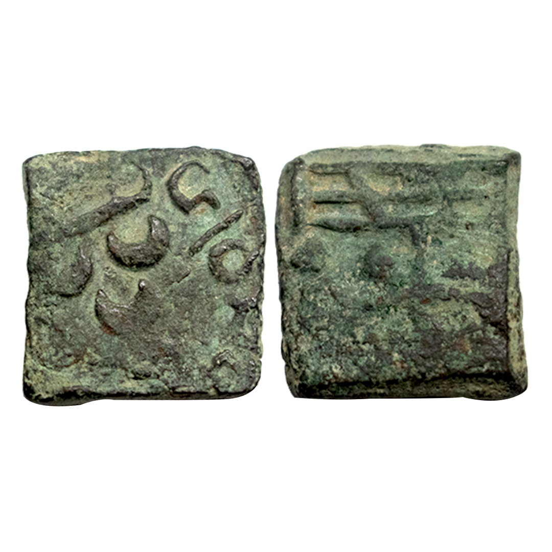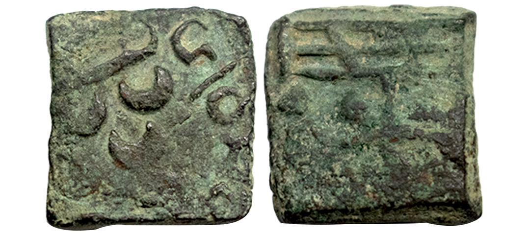 Maharathis of Andhra & Vidarbha, Pusavaruna, Copper Unit, 4.93Grms, OBV: Lion standing facing to right side with tail upraised around Brahmi legend start from 11 0 Clock ‘Maharathisa Pusavaraunasa’, REV: Tree-in-railing (partly visible). (Pieper # 2537).
