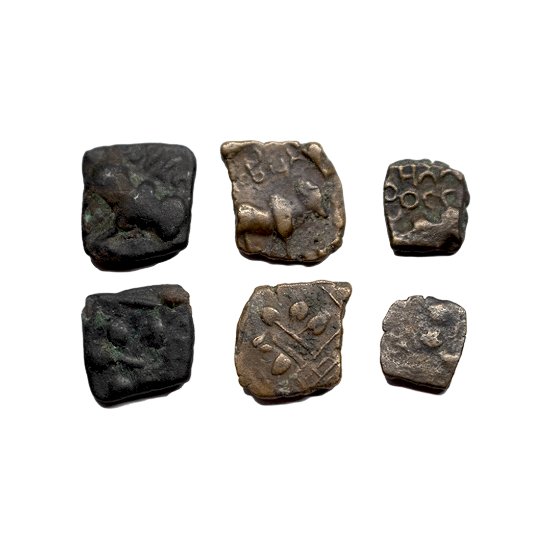 Satavahanas, Kochhiputra Siri Satakarni (c. 60-40 BC), Newase-Paithan Region, Copper Unit (3 coins), OBV: Humped bull standing facing to right side with Brahmi legend ‘…chiputasa..takani..’, REV: Tree-i-railing with broad leaves. (Pieper # 2628). Fine to Very Fine.