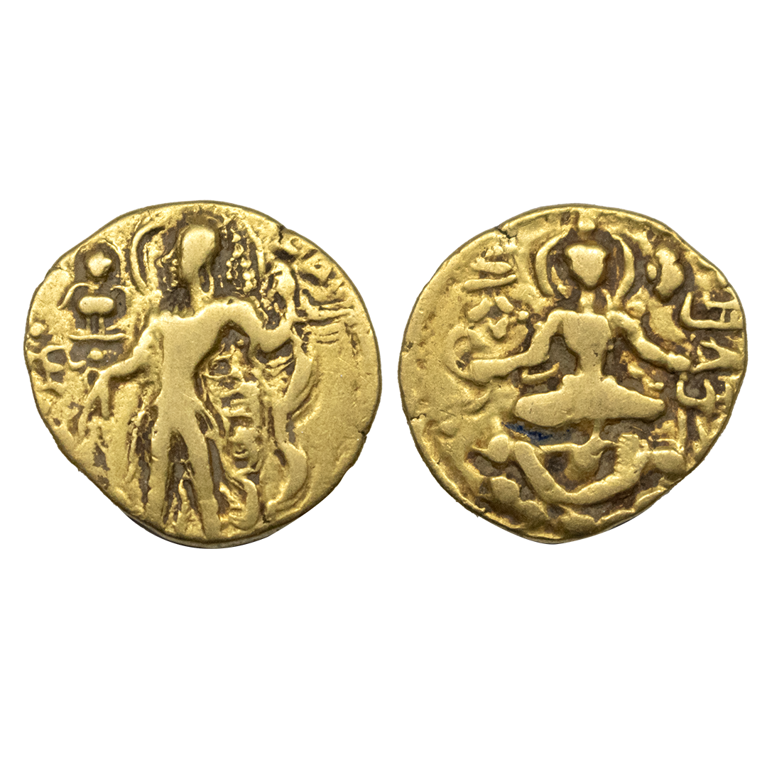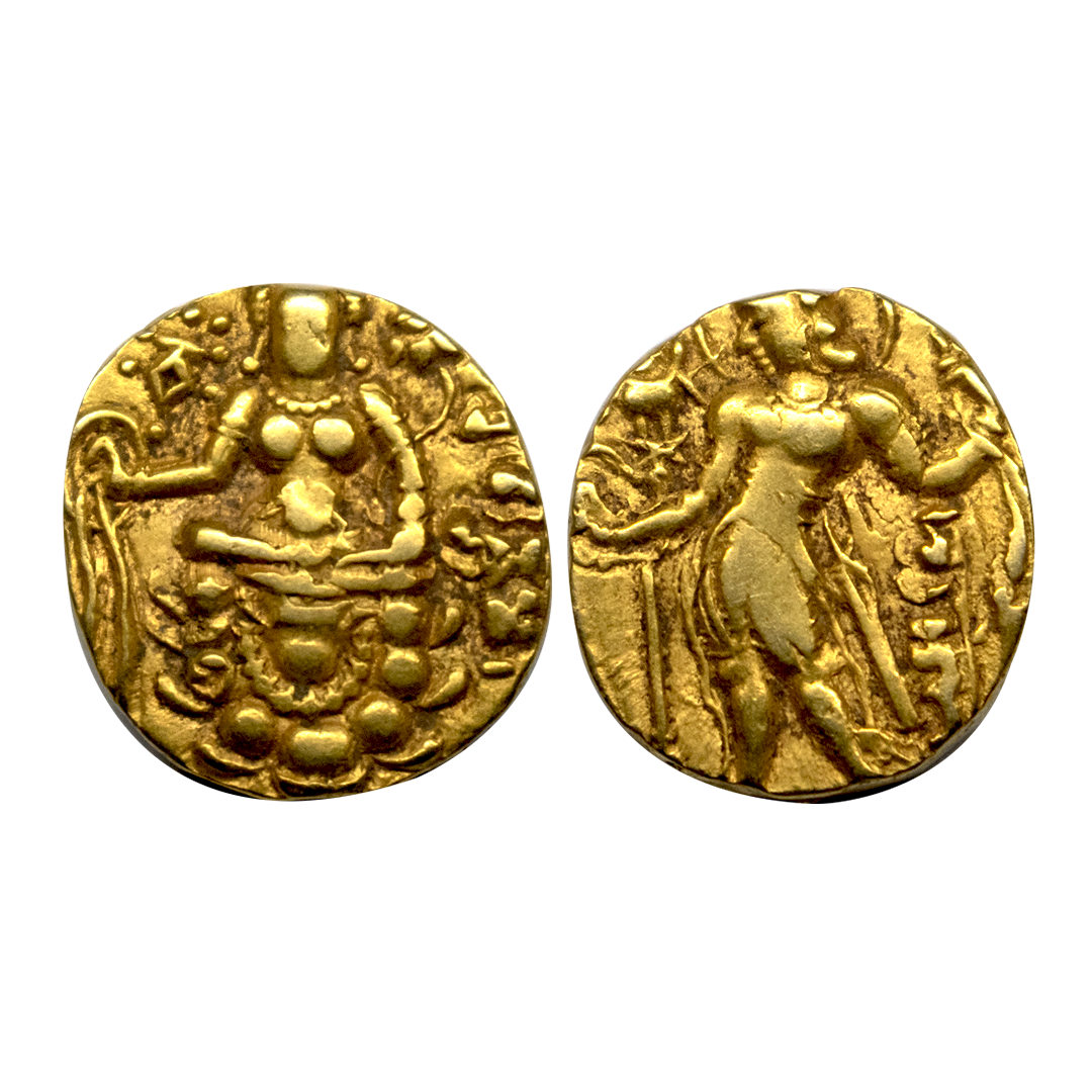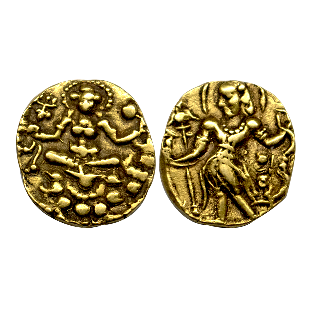 Chandragupta II (c.380-415AD) Archer type with Sword at Waist, Gold Dinar, 8.23g, Altekar Class II, Variety F (sword at waist), TOTGE S.1, Obv: king wearing dhoti, standing to right with the bow in left hand and sword hanging at his waist. Brahmi legend Chandra under his arm and traces of legend Deva Srimaharaja… around. Rev: Goddess Lakshmi seated on a lotus and holds a lotus flower in her left hand and a diadem in her right hand; Brahmi legend Shri Vikramah in right field. Very Fine+, Very Rare.