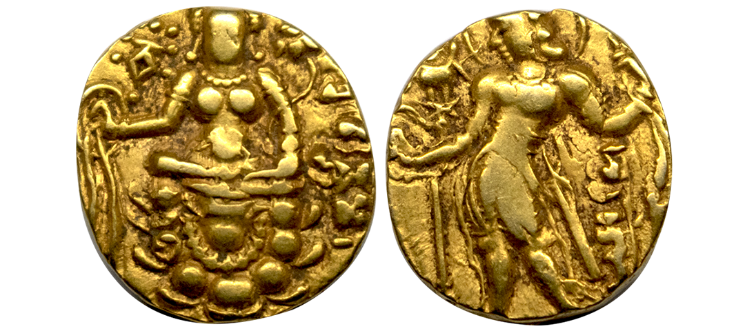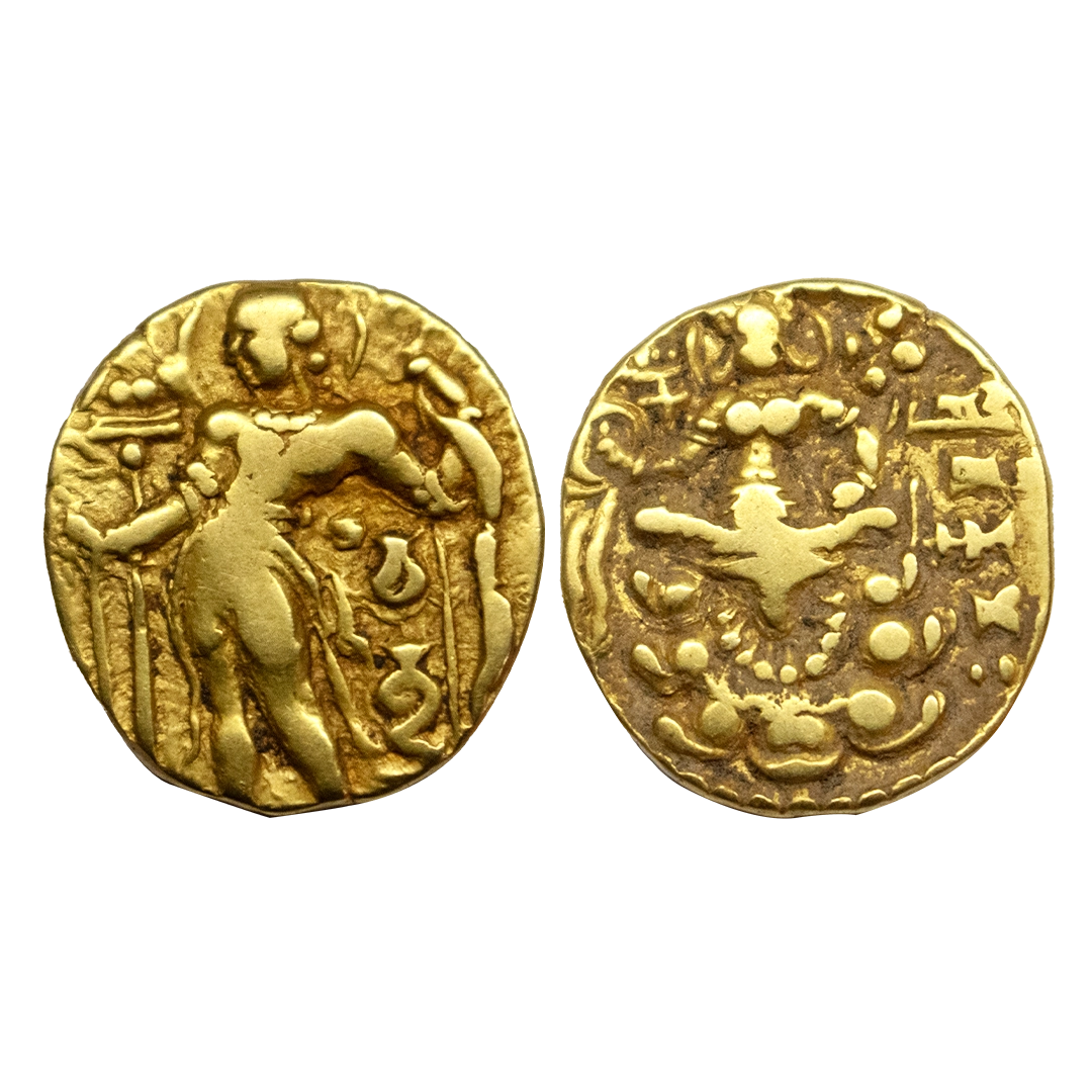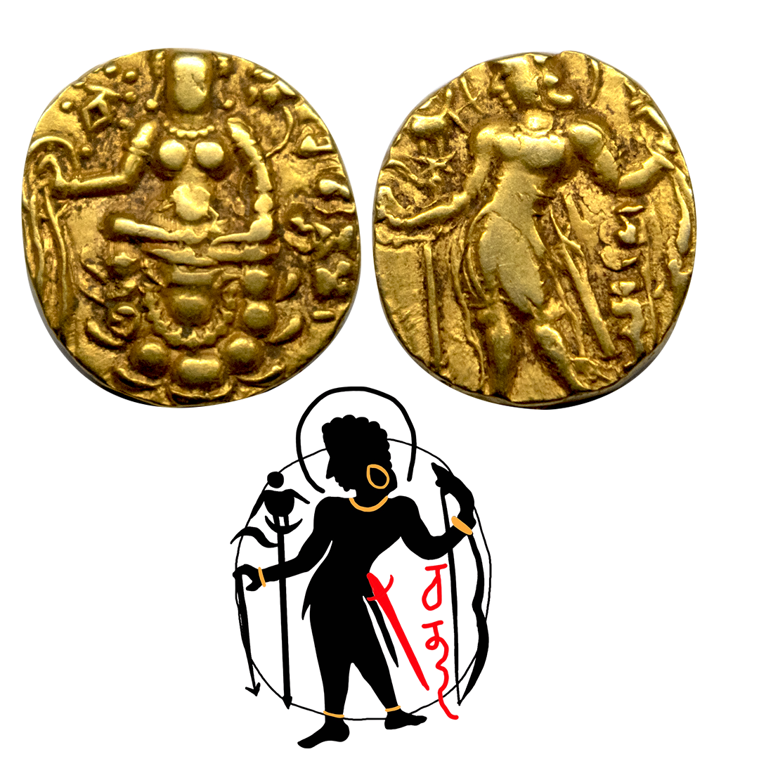 Chandragupta II (c.380-415AD) Archer type with Sword at Waist, Gold Dinar, 8.23g, Altekar Class II, Variety F (sword at waist), TOTGE S.1, Obv: king wearing dhoti, standing to right with the bow in left hand and sword hanging at his waist. Brahmi legend Chandra under his arm and traces of legend Deva Srimaharaja… around. Rev: Goddess Lakshmi seated on a lotus and holds a lotus flower in her left hand and a diadem in her right hand; Brahmi legend Shri Vikramah in right field. Very Fine+, Very Rare.