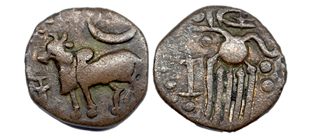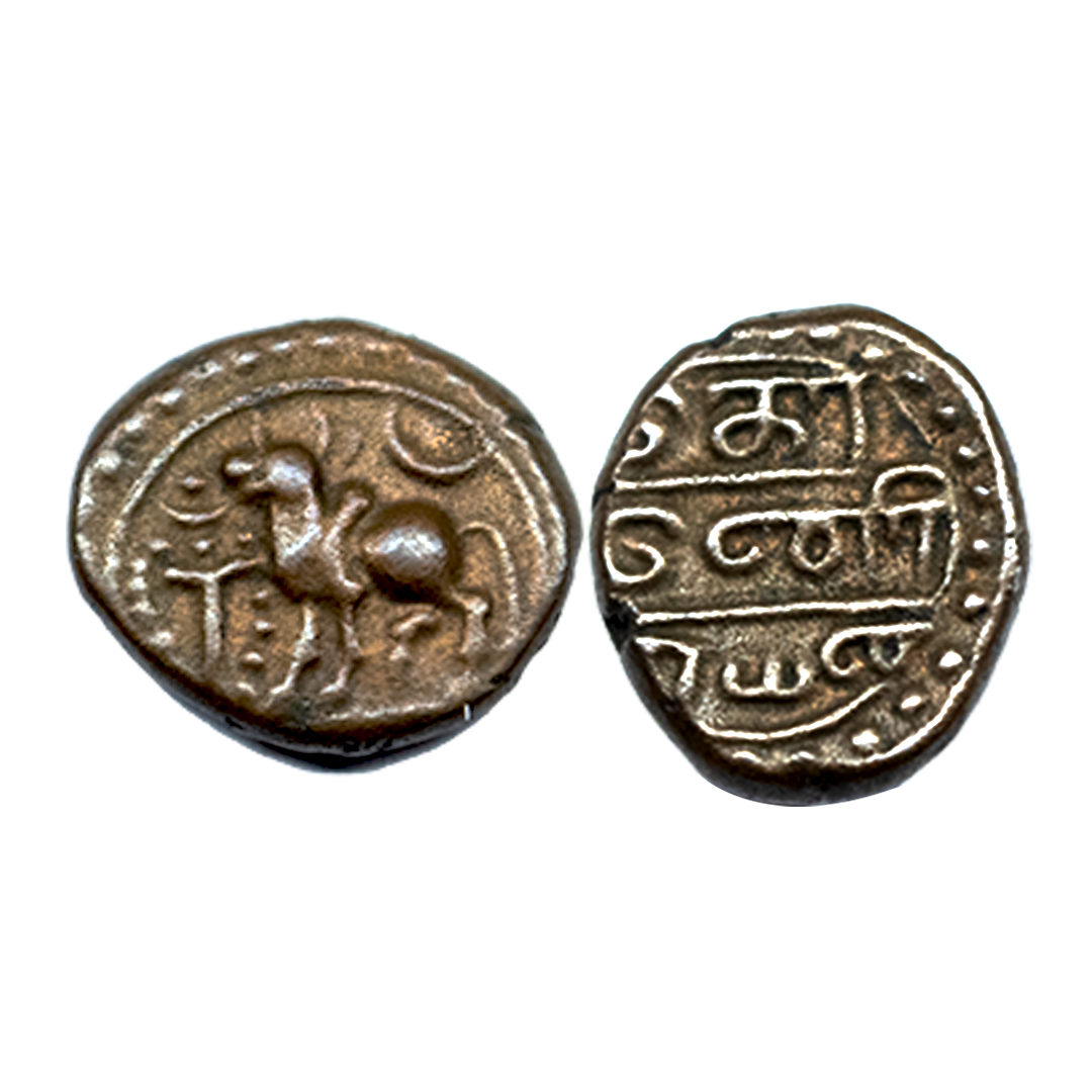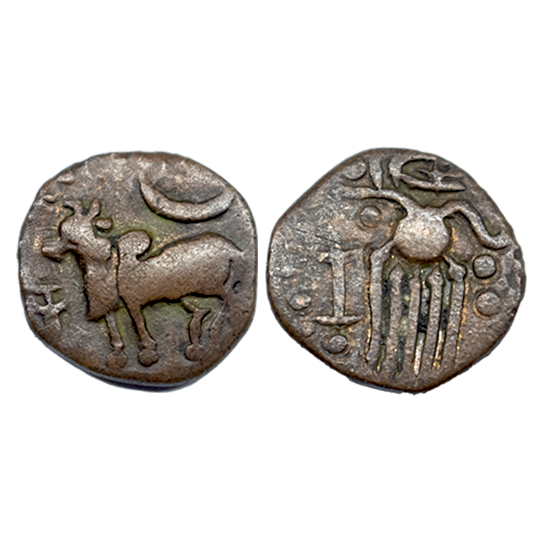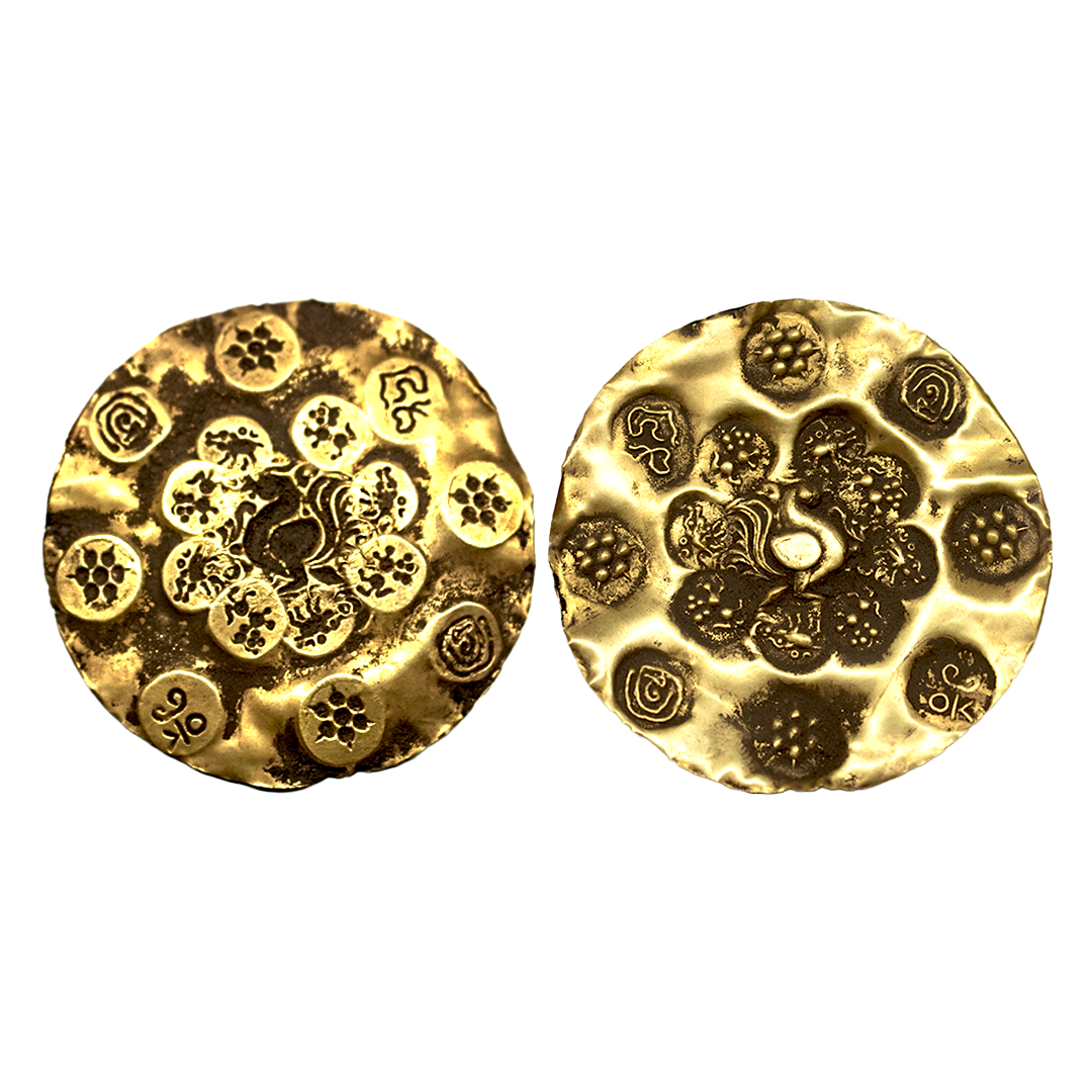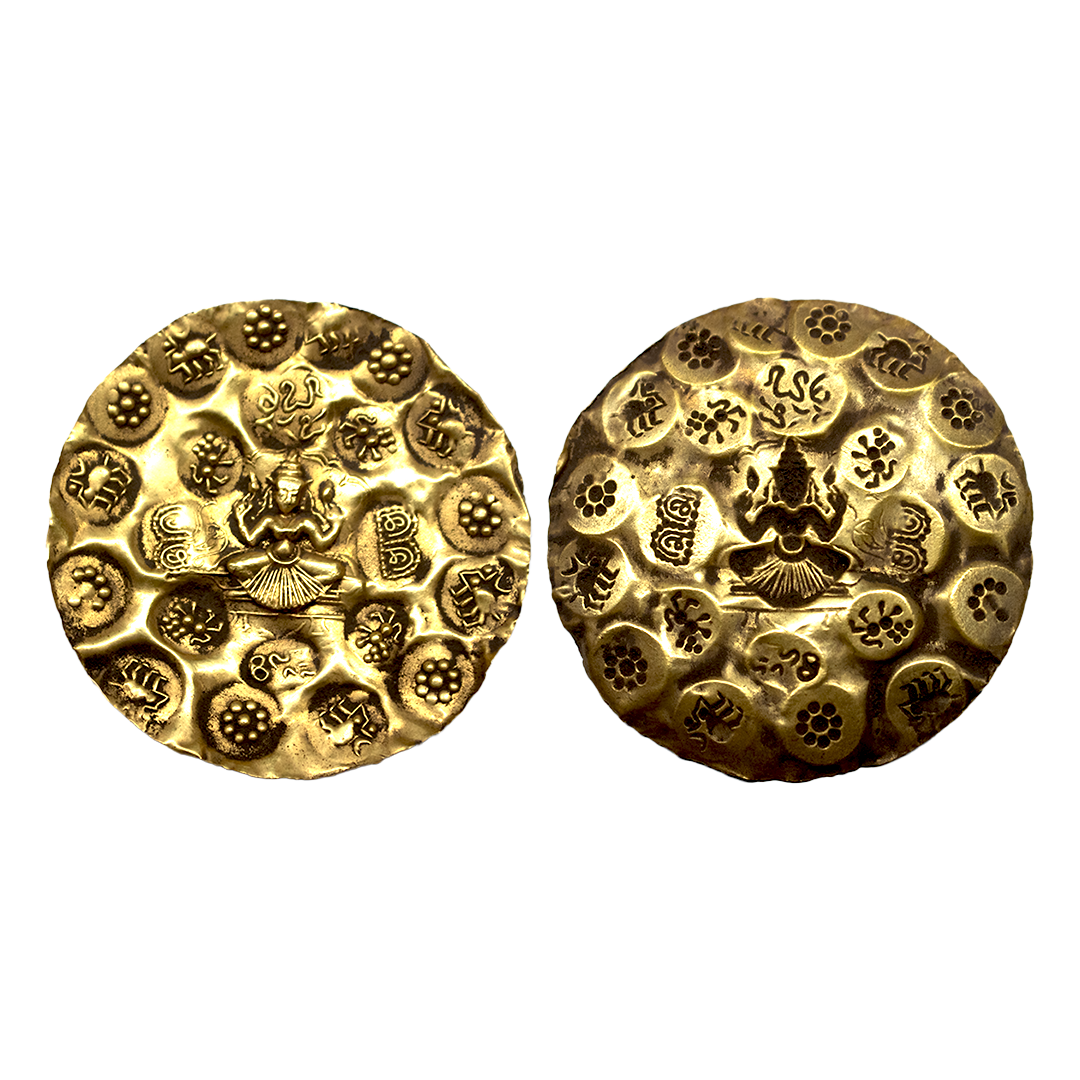 Kakatiyas of Warangal, Prola II (1110-1158 CE), Gold PMC, One-and-a-Half Gold (1 1/2) Gadyana, Goddess Mahalakshmi type, 5.86g, 55x55mm. Total of 23 repousse punches, discretely and deeply struck in three concentric tiers on a thin and broad flan. 1x central punch of the Goddess Mahalakshmi seated in padmasana facing front with draped saree. She holds Lotus in her upper two hands and shows mudras in her lower hands. The peripheral punches are stuck in two layers, the first-tier Kannada punches consist of 2x 'Sri Sri', 1x 'Ahita Gaja', 1x 'Kesari' and 4x Lion standing acing right with raised foreleg. The Outer layer consists of 7x Boar standing facing right and 7x Lotus placed alternately, all on obverse. Extremely fine, Uncleaned, Very rare. The Kakatiya dynasty succeeded the Nolamba dynasty and ruled for a brief period and their coins are extremely rare. Prola-II was a feudatory to the Chalukya Vikramaditya-VI and proclaimed independence with the decline of the Chalukyas. Prola-II extended his kingdom up to Krishna district.