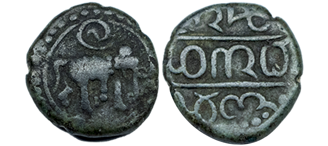 Saurashtra Region, Chudasama, Copper Unit, 2.95Grms, OBV: Elephant walking to right in circle around dotted border, REV: Nagari letter ‘Shri’ in circle around dotted border. Very Fine