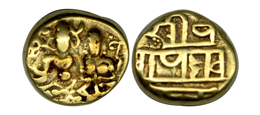 Yadavas of Devagiri, Ramachandra Deva (c. 1270-1311 AD), Gold Padma Tanka, 3.74Grms, OBV: Lotus in centre, on top Nagari legend 'Sri Ram', below dagger, conch on bottom and twice 'Sri' in kannada letter, Uniface. (Mitch K&A # 289). Fine+.