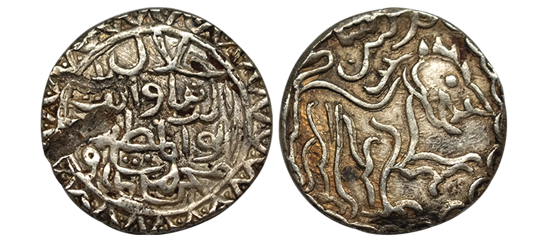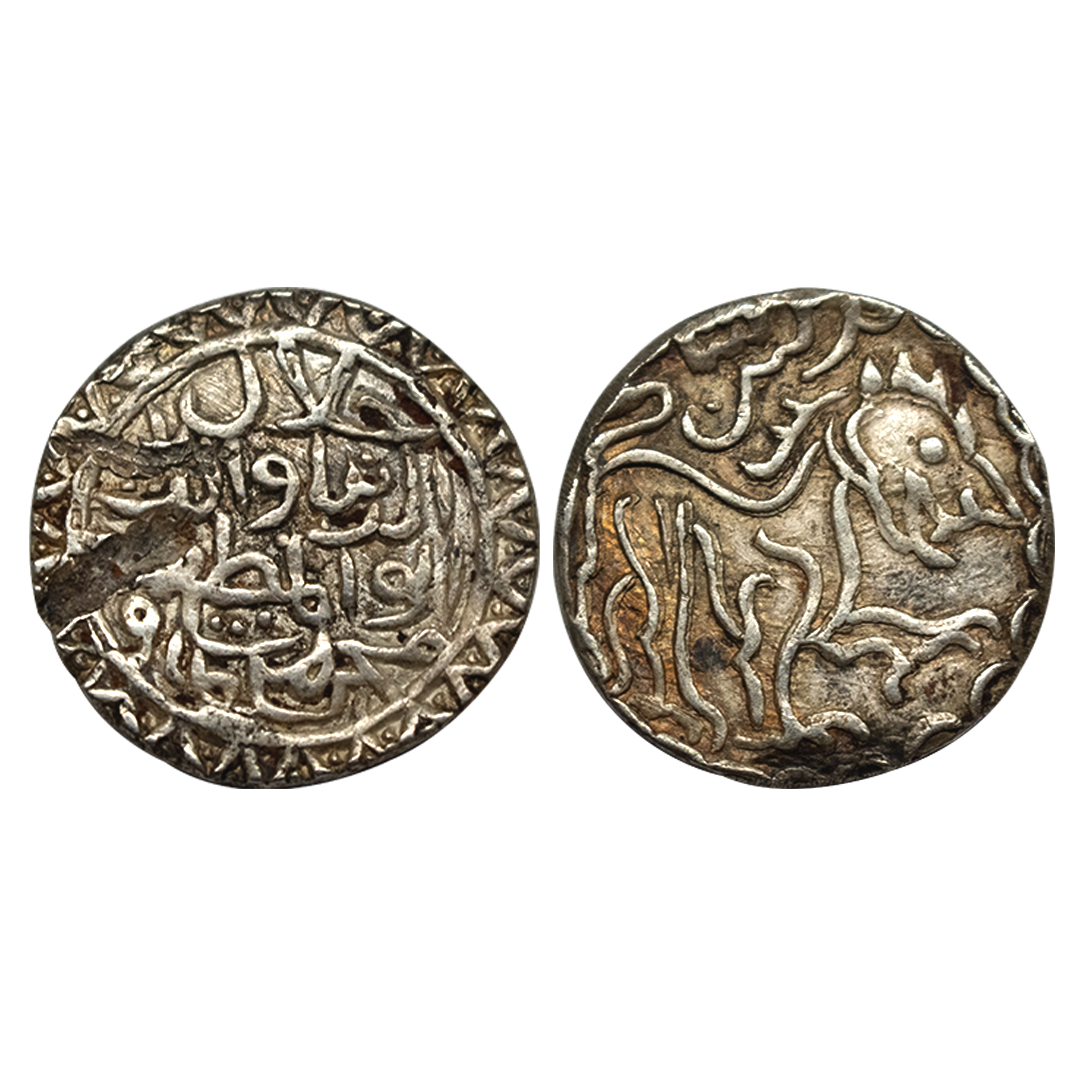 Jalal-al-din Muhammad, Silver Tanka, Lion Type, Second reign (AH 821- 837), 10.37g. Obv: Lion facing to right, short inscription above, Rev: ruler's title within circle with ornamental border, (G/G B342). About Extremely Fine, Extremely Rare