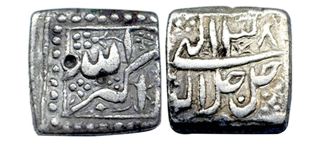 Akbar (AH 963-1014 / 1556-1605 AD), Silver Square ½ Rupee, 5.28Grms, Mintless and Monthless, Year 38, Jalla Jalalahu on obv and Allahu Akbar on rev., floral design on both sides. (KM # 64.1). Very Fine.