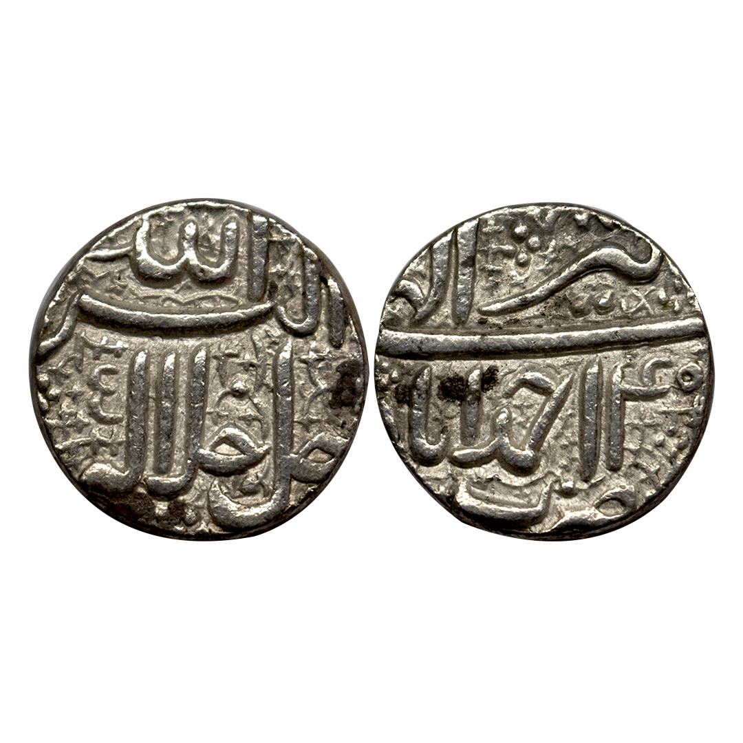 Akbar (AH 963-1014 / 1556-1605 AD), Silver Square Rupee, 11.32Grms, Ahmadabad Mint, Ilahi type, Month Tir, Year 39. (KM # 88.1). Fine.