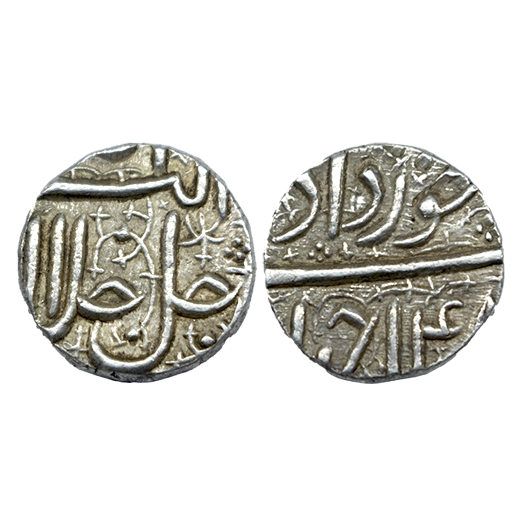 Akbar (AH 963-1014 / 1556-1605 AD), Silver Square Rupee, 11.32Grms, Ahmadabad Mint, Ilahi type, Month Tir, Year 39. (KM # 88.1). Fine.