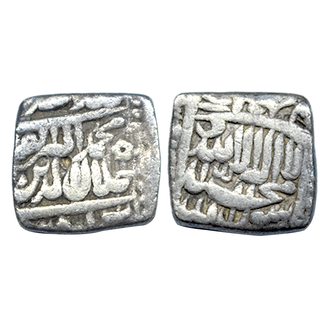 Akbar (AH 963-1014 / 1556-1605 AD), Silver Square ½ Rupee, 5.20Grms, Urdu Zafar Qarin Mint, AH 1000 (Alf), Kalima on obv. (KM # 61.4). Very Fine.
