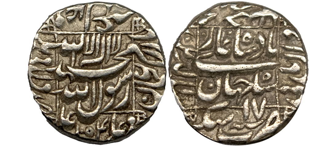 Shah Jahan (AH 1037-1068 / 1628-1658 AD), Silver Rupee, 11.38Grms, Akbarnagar Mint, AH 1044, RY 7, mint name on rev left margin with complete mint name, both sides central inscription within square area knots on each corner. (KM # 235.4). Very Fine.