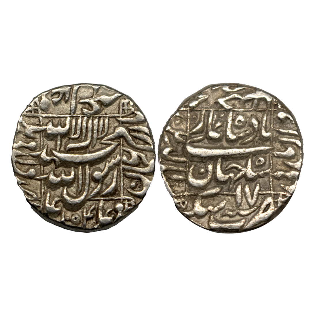 Shah Jahan (AH 1037-1068 / 1628-1658 AD), Silver Rupee, 11.38Grms, Akbarnagar Mint, AH 1044, RY 7, mint name on rev left margin with complete mint name, both sides central inscription within square area knots on each corner. (KM # 235.4). Very Fine.