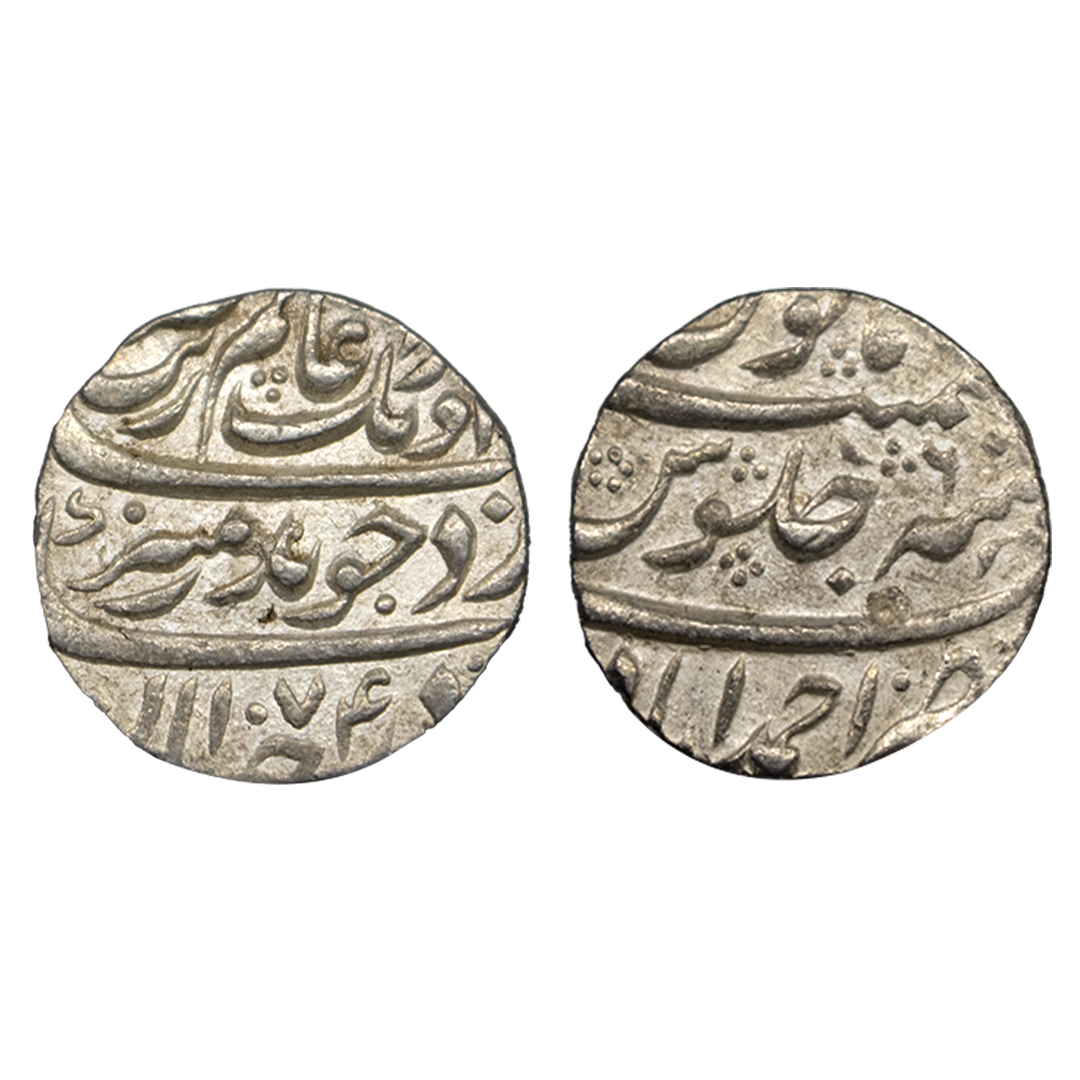 Aurangzeb (AH 1068-1118 / 1658-1707 AD), Silver Rupee, 11.54Grms, Ahmadabad Mint, AH 1074, RY 6, badr-e-munir type, almost complete mint name on rev bottom area. (KM # 300.2). Very Fine+.