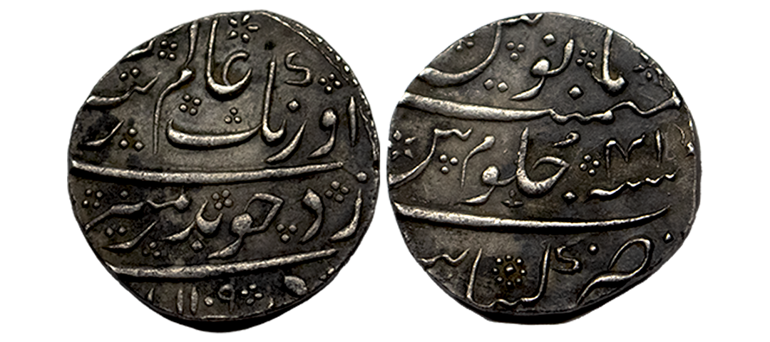 Aurangzeb (AH 1068-1118 / 1658-1707 AD), Silver Rupee, 11.38Grms, Khambayat Mint, AH 1109, RY 41, With Extra Word "Mim", Badr-e-munir type, complete mint name on rev bottom area. (KM # 300.51). Very Fine+.