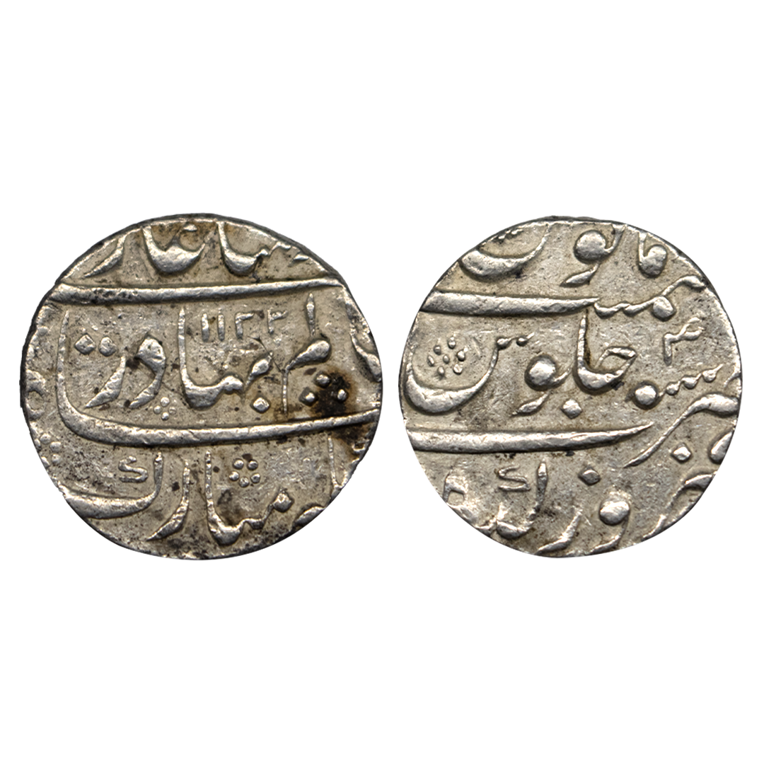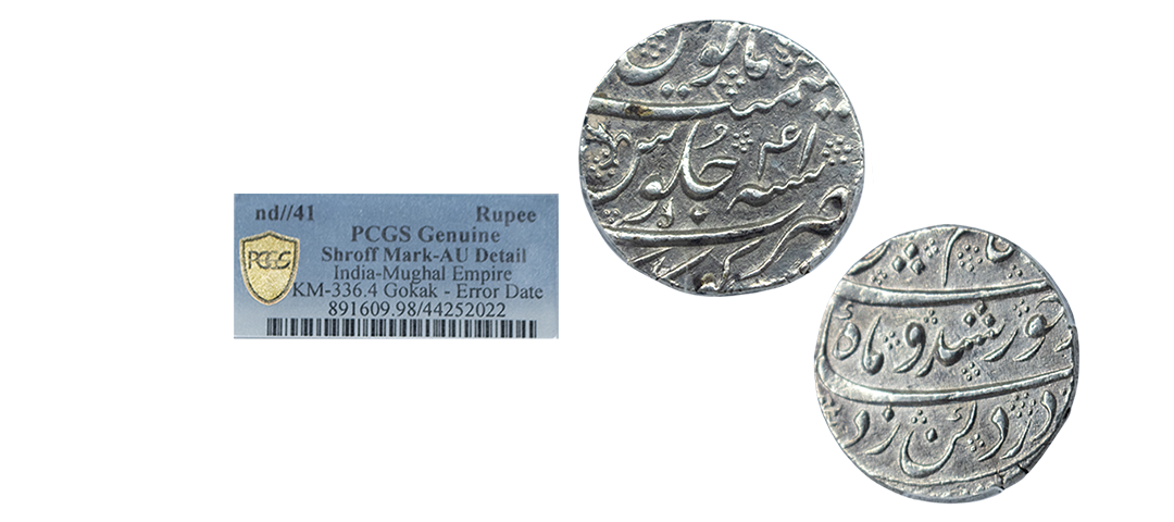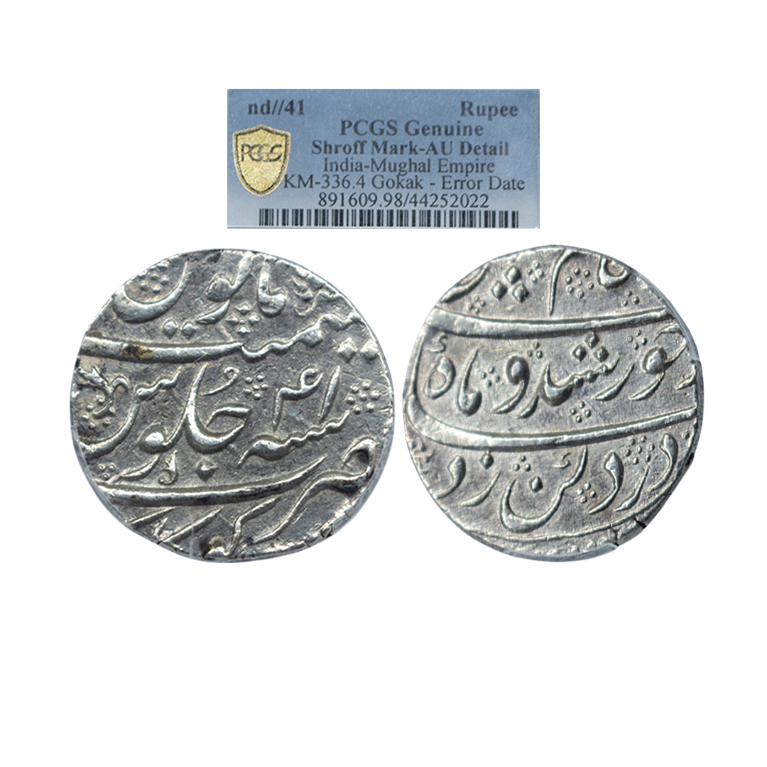 Kam Bakhsh (1707-1708 AD), silver rupee, Gokak mint, RY 41 (error date), KM 336.4. Obv: Legend khursheed-o-mah, badshahe kam bakhsh, din panah. Rev: Mint-name, Jalus Maimanat Manus and RY. About Uncirculated, Shroff Mark Edge, Graded by PCGS, Excedingly rare.