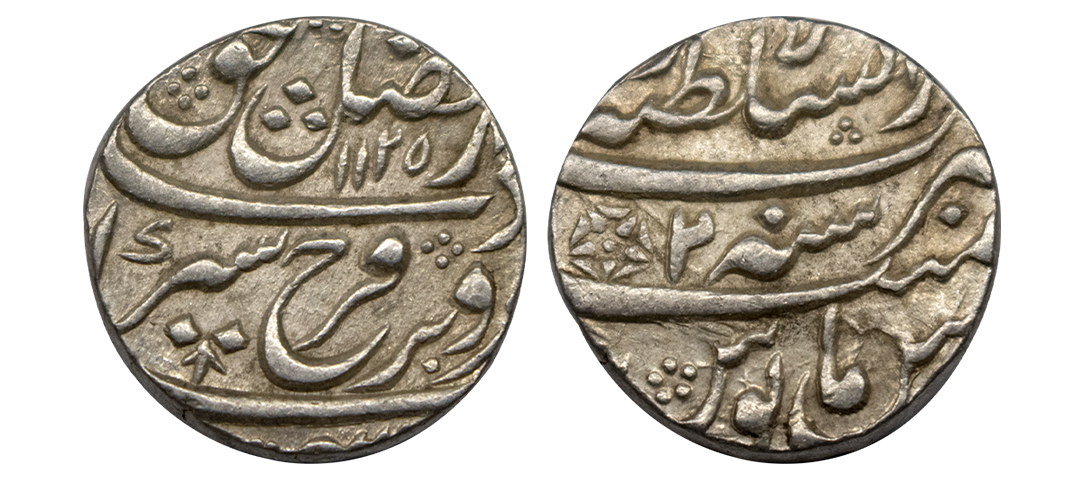 " /> 1124-1131 / 1713-1719 AD), Gold Mohur, 10.94Grms, Khujista Bunyad (Aurangabad) Mint, RY 7, Baher-o-bar type, complete mint name on rev bottom area. (KM # 408.4). " />Lot No: 356