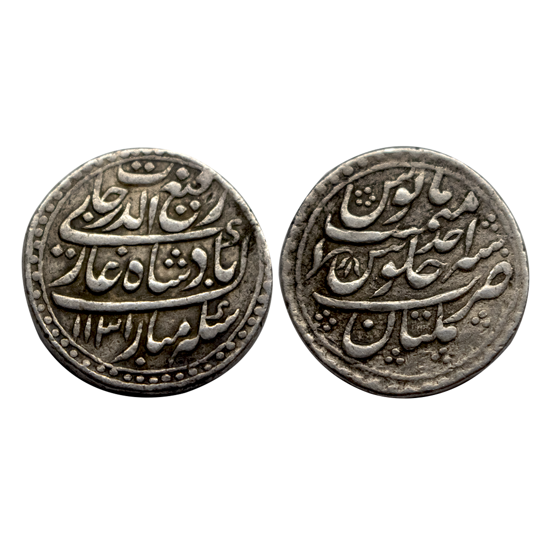 Rafi-ud-Darjat (AH 1131 / 1719 AD), Silver Rupee, 11.42Grms, Big Flan, Multan Mint, AH 1131, RY Ahd, complete both sides legend with dotted circle. (KM # 405.15). Very Fine+.
