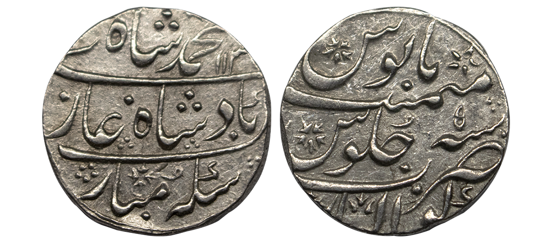 Muhammad Shah (AH 1131-1161 / 1719-1748 AD), Silver Rupee, 11.37Grms, Gwalior Mint, AH 113X, RY 4, almost mint name on rev bottom area. (KM # 436.25). Extremely Fine.
