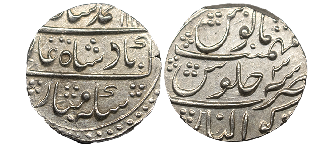 Muhammad Shah (AH 1131-1161 / 1719-1748 AD), Silver Rupee, 11.37Grms, Gwalior Mint, AH 113X, RY 4, almost mint name on rev bottom area. (KM # 436.25). Extremely Fine.