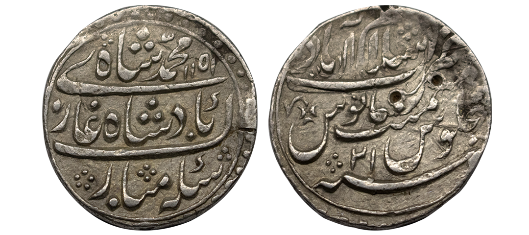 Muhammad Shah (AH 1131-1161 / 1719-1748 AD), Silver Rupee, 11.37Grms, Gwalior Mint, AH 113X, RY 4, almost mint name on rev bottom area. (KM # 436.25). Extremely Fine.