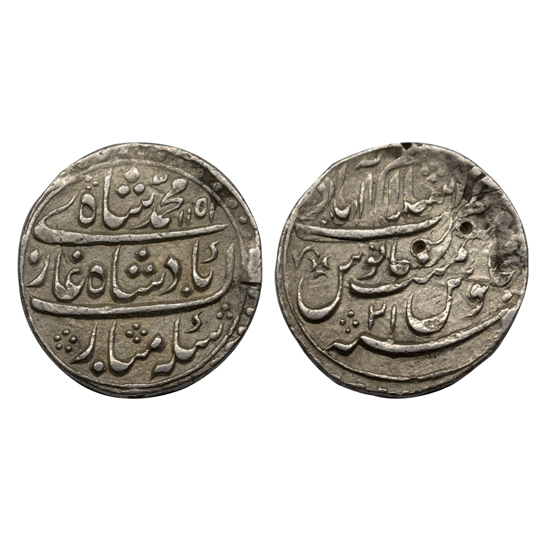 Muhammad Shah (AH 1131-1161 / 1719-1748 AD), Silver Rupee, 11.37Grms, Gwalior Mint, AH 113X, RY 4, almost mint name on rev bottom area. (KM # 436.25). Extremely Fine.