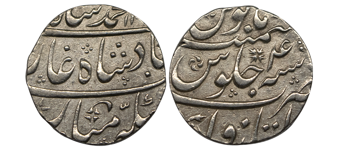 Muhammad Shah (AH 1131-1161 / 1719-1748 AD), Silver Rupee, 11.33Grms, Gwalior Mint, AH 113X, RY 5. (KM # 436.25). Extremely Fine.