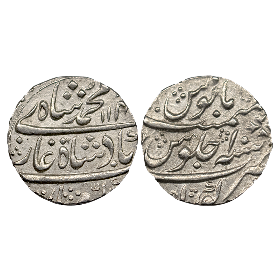 Muhammad Shah (AH 1131-1161 / 1719-1748 AD), Silver Rupee, 11.37Grms, Itawa Mint, RY 4, almost mint name on rev bottom area. (KM # 436.29). Extremely Fine.