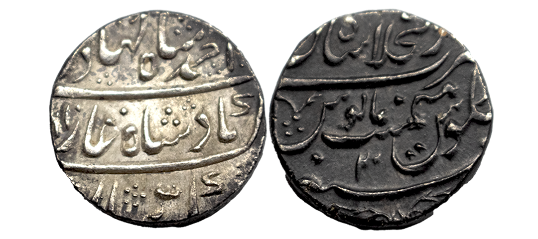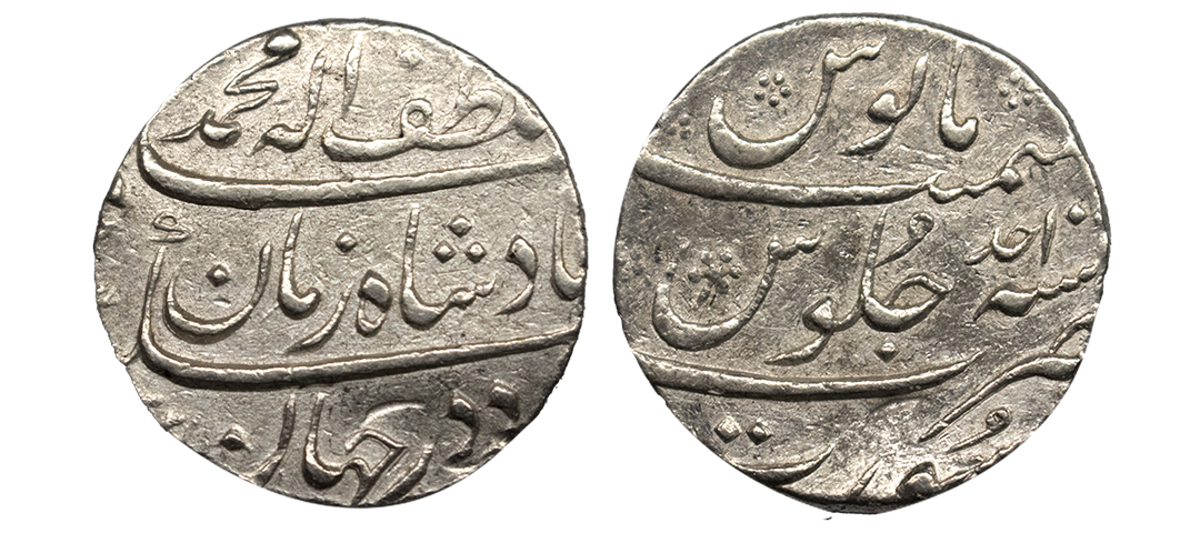 Muhammad Shah (1719-1748 AD), silver rupee, Murshidabad mint (fully visible), AH 1144/RY 13, KM 436.46, 11.58g. Mint and Date Completely Visible, Struck on a Broad Flan. Good very fine, Very Rare.