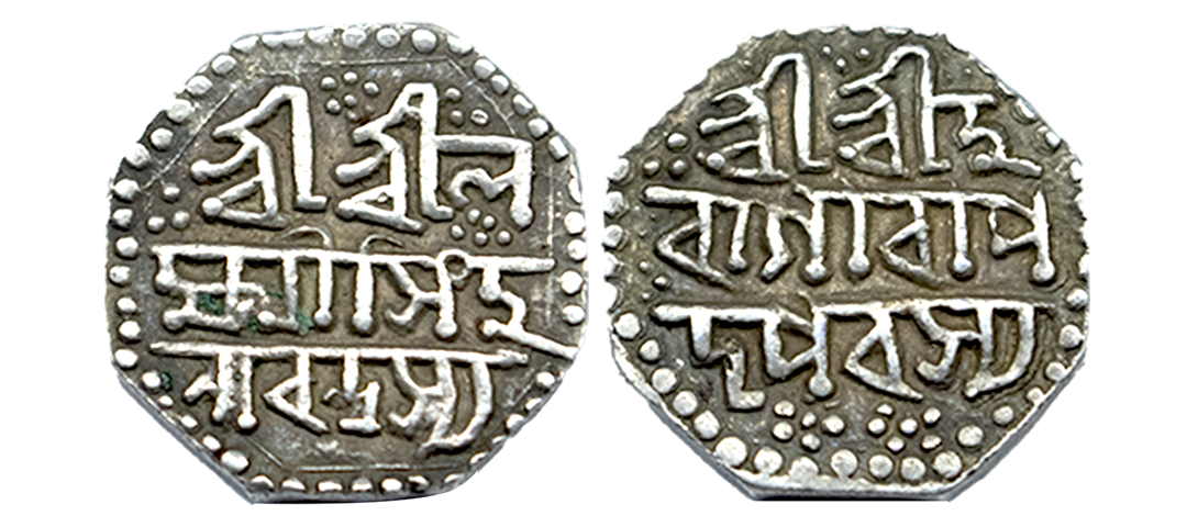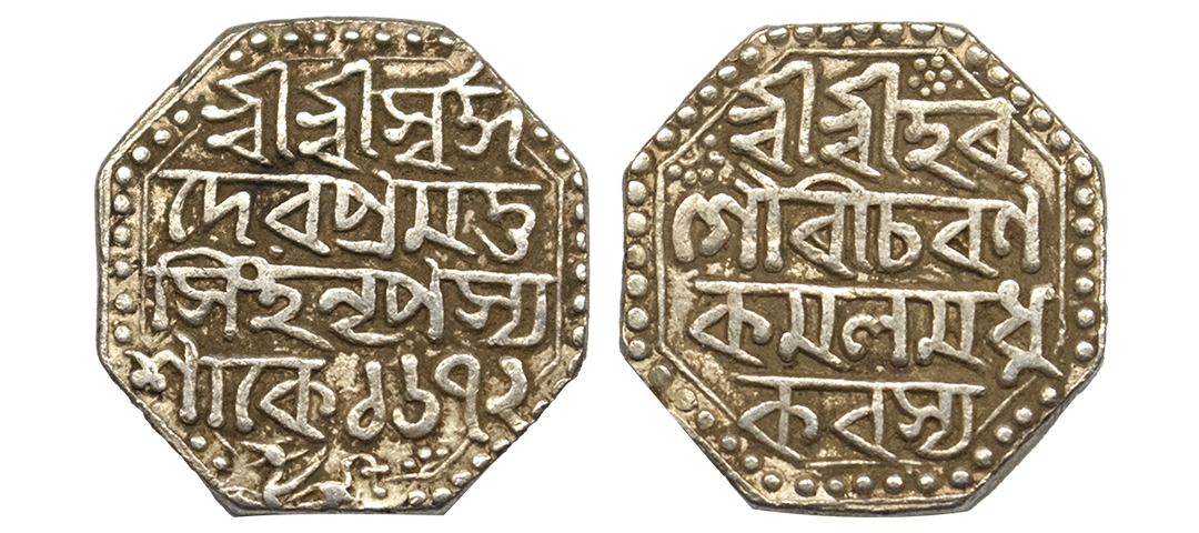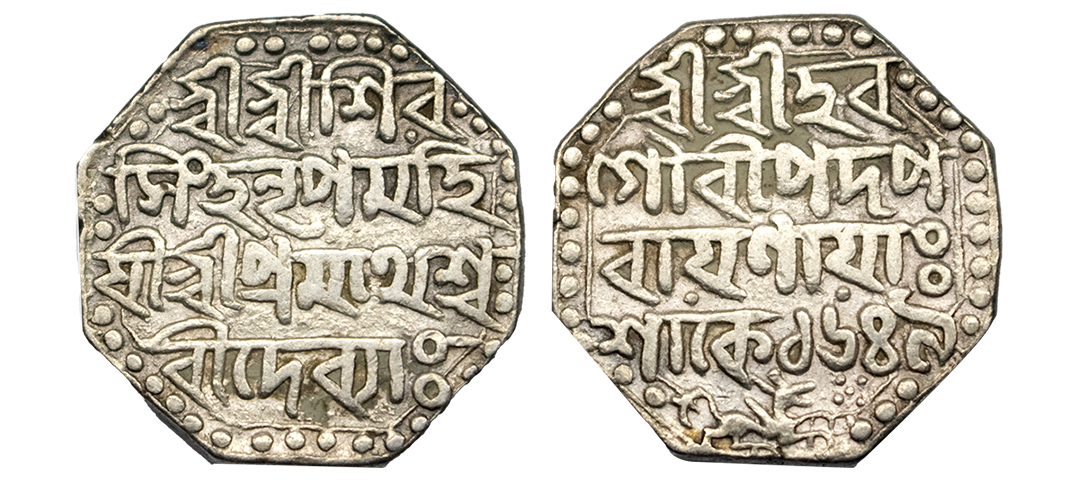 Assam, Siva Simha (1714-1744 AD), silver round rupee with citing Queen Pramathesvari, Rangpur mint, sake 1649/RY 14, 11.27g. Obv: Persian legend Siva Singh Shah/Sikkah Zad chu mahr/Bahm Begam Pramathesvari/Shah, elow winged lion facing to right. Rev: Persian legend Manus/Maimanut/Sanah 14 Jalus/Zarb/Rangpur 1649, R&B I13.1. Uncirculated, Rare.