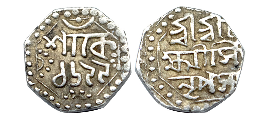 Assam, Shiva Simha, citing Queen Phulesvari, Silver Rupee, 11.41g, SE 1649, Assamese legend on both sides within dotted border, Obverse: “Sri Sri Hara/ Gauri Pada Pa/rayanayah/ Sake 1649”, Flower at bottom right, Lion to right, Reverse: “Sri Sri Siva/ Simha Nrpa Mahi/si Sri Phulesva/ri Devyah” (R&B# H12.1). Extremely fine, Rare.