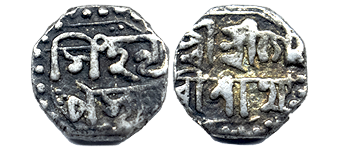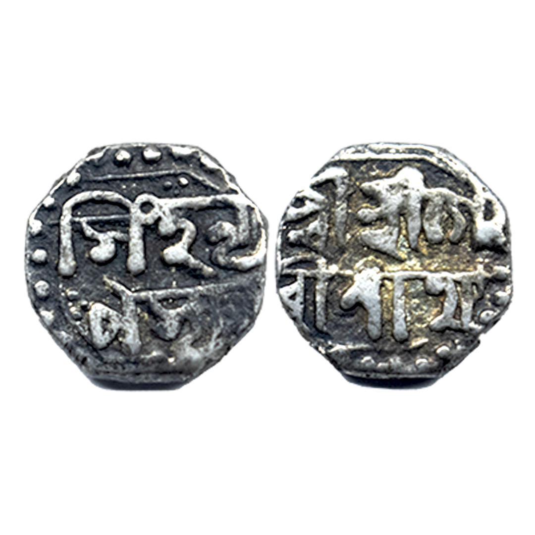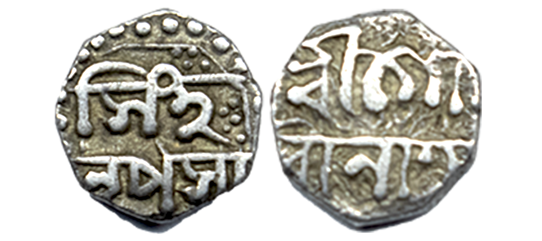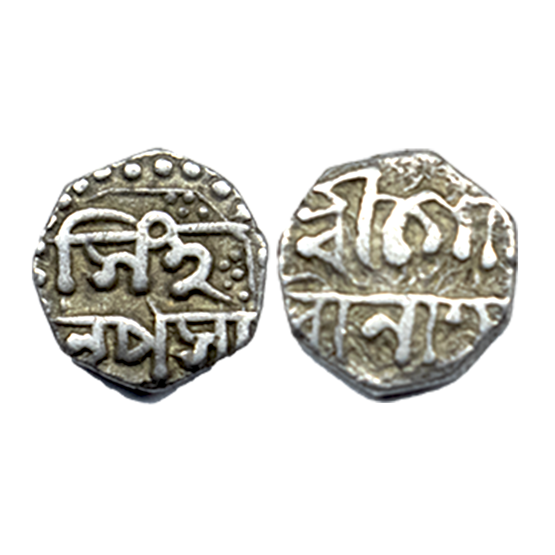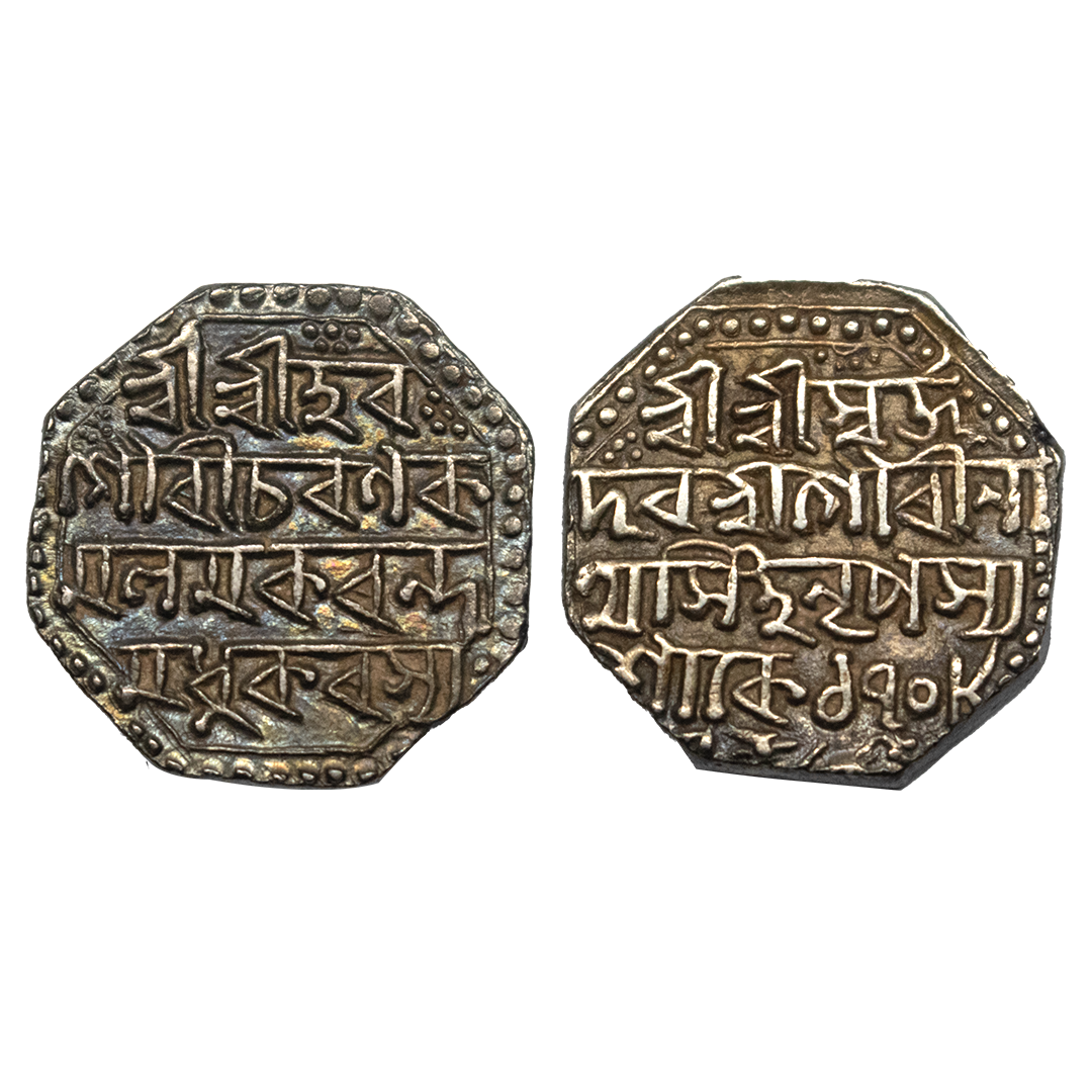 Assam, Gaurinatha Simha, Silver Rupee, 11.39g, SE 1706/ 5, Assamese legend on both sides within dotted border, Obv: “Sri Sri Hara/ Gauri Charana/Kamala Madhu/karasya”, Rev: “Sri Sri Svarga/ Deva Gaurina/ tha Simha Nrpasya/ Sake 1706/ 5”, Crude calligraphy, Lion to left at bottom with figure 5 to the left (R&B# R35.1). Extremely fine.
