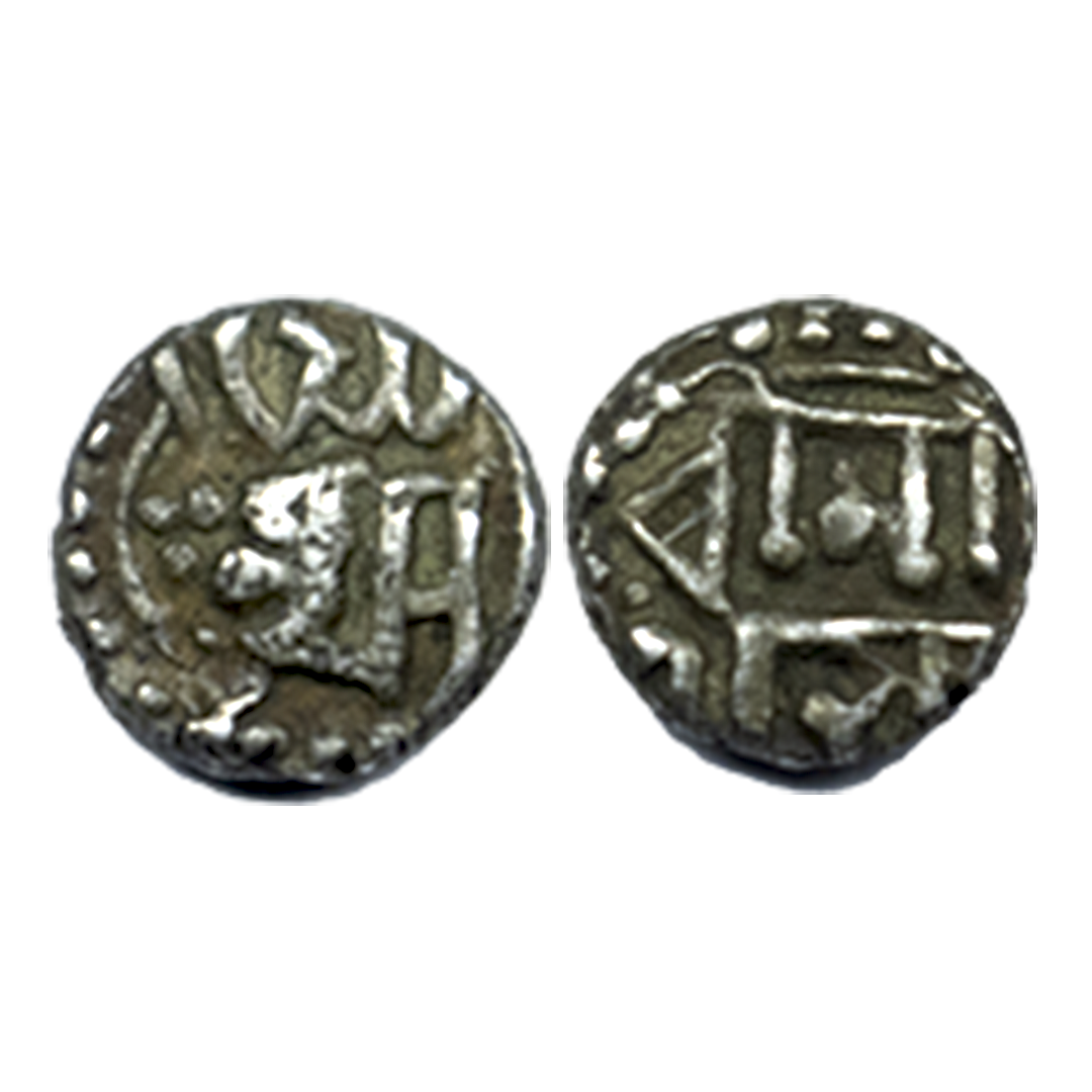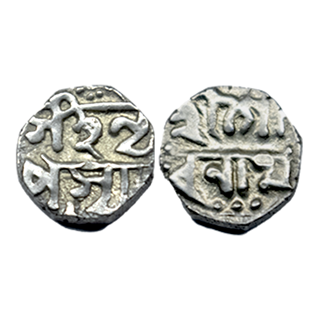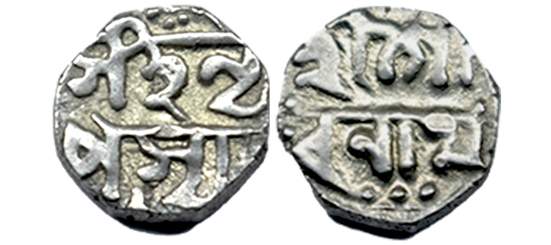 Assam, Gaurinath Simha (1780-1795 AD), silver ⅛ rupee, without Date, 1.38g. Obverse: “Sri Sri Gau/rinath”. Reverse: Simha Nri/pasya, both sides legend in two lines. R&B# R124.1, Good Very fine.