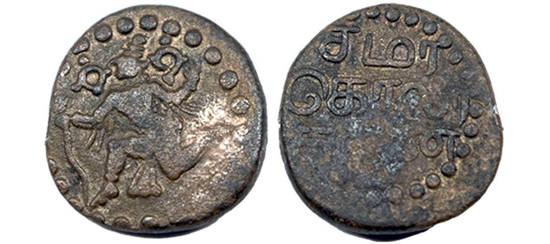 Banas, Samarakolakalan, Copper Kasu, 3.24Grms, OBV: Garuda running left, holding a serpent, flanked by conch and discus, Lined and dotted border around, REV: Tamil legend in three lines reading ‘Sa ma ra/ko la/ka la n’, Dotted border around. (K Ganesh # 8.7, The Coins of Tamilnadu). Very Fine+.