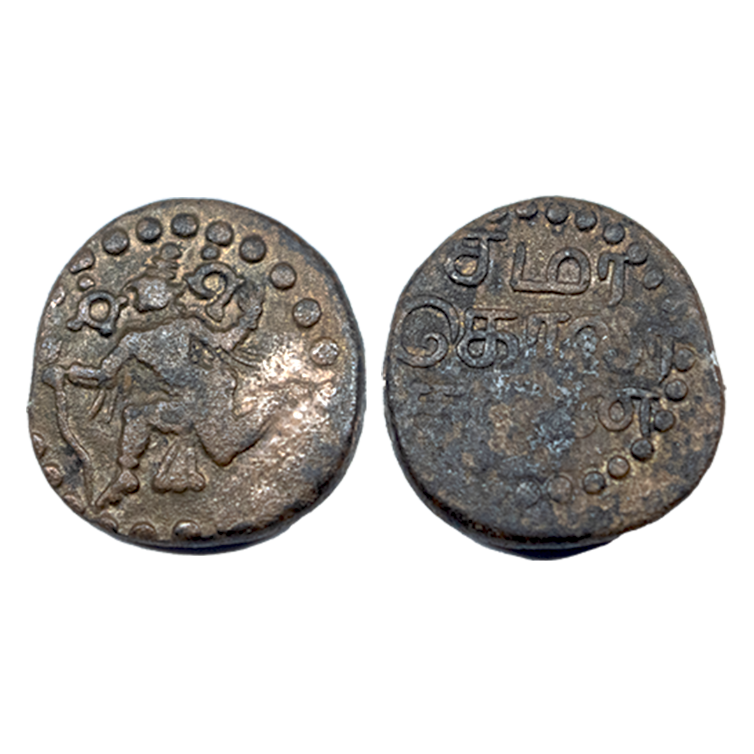Banas, Samarakolakalan, Copper Kasu, 3.24Grms, OBV: Garuda running left, holding a serpent, flanked by conch and discus, Lined and dotted border around, REV: Tamil legend in three lines reading ‘Sa ma ra/ko la/ka la n’, Dotted border around. (K Ganesh # 8.7, The Coins of Tamilnadu). Very Fine+.