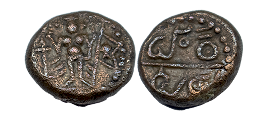 Madurai Nayaks, Anonymous issue, Copper Kasu, 1.73Grms, OBV: Siva and Parvati seated with siva holding trishul, REV: Tamil legend Sri vira’. (K Ganesh # 5.93, The Coins of Tamilnadu). Very Fine.
