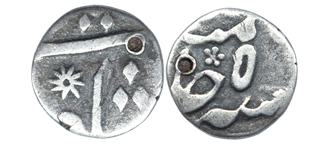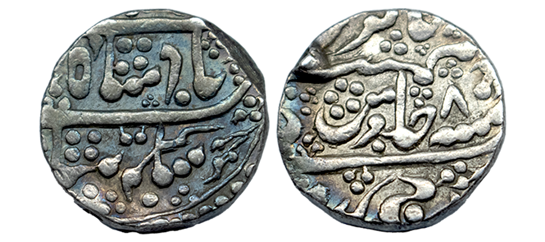 Tripura, Krishna Kishor Manikya (1830-1849 AD), Silver Tanka, 10.63g. SK 1752. Citing Queen Bidhukana, Obverse: Lion facing left, trident on back, date on three sides around lion, all within circular border of petals with three vertical lines each. Reverse: “Radha Krishna pa/de sri sri yuta Krishna/Kishor manikya/deva sri srimati Bi/dhukana maha/Devyau”, (R&B# 274), PCGS graded as AU details, Very rare.